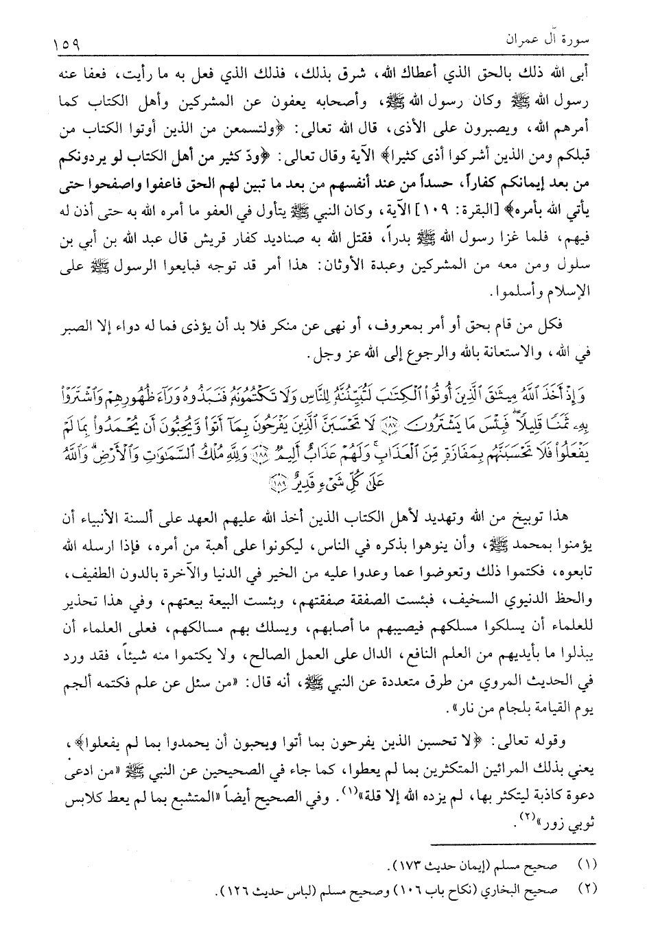 وَإِذْ أَخَذَ اللَّهُ مِيثاقَ الَّذِينَ أُوتُوا الْكِتابَ لَتُبَيِّنُنَّهُ لِلنَّاسِ وَلا تَكْتُمُونَهُ فَنَبَذُوهُ وَراءَ ظُهُورِهِمْ وَاشْتَرَوْا بِهِ ثَمَناً قَلِيلاً فَبِئْسَ مَا يَشْتَرُونَ (187) لَا تَحْسَبَنَّ الَّذِينَ يَفْرَحُونَ بِما أَتَوْا وَيُحِبُّونَ أَنْ يُحْمَدُوا بِما لَمْ يَفْعَلُوا فَلا تَحْسَبَنَّهُمْ بِمَفازَةٍ مِنَ الْعَذابِ وَلَهُمْ عَذابٌ أَلِيمٌ (188) وَلِلَّهِ مُلْكُ السَّماواتِ وَالْأَرْضِ وَاللَّهُ عَلى كُلِّ شَيْءٍ قَدِيرٌ (189)