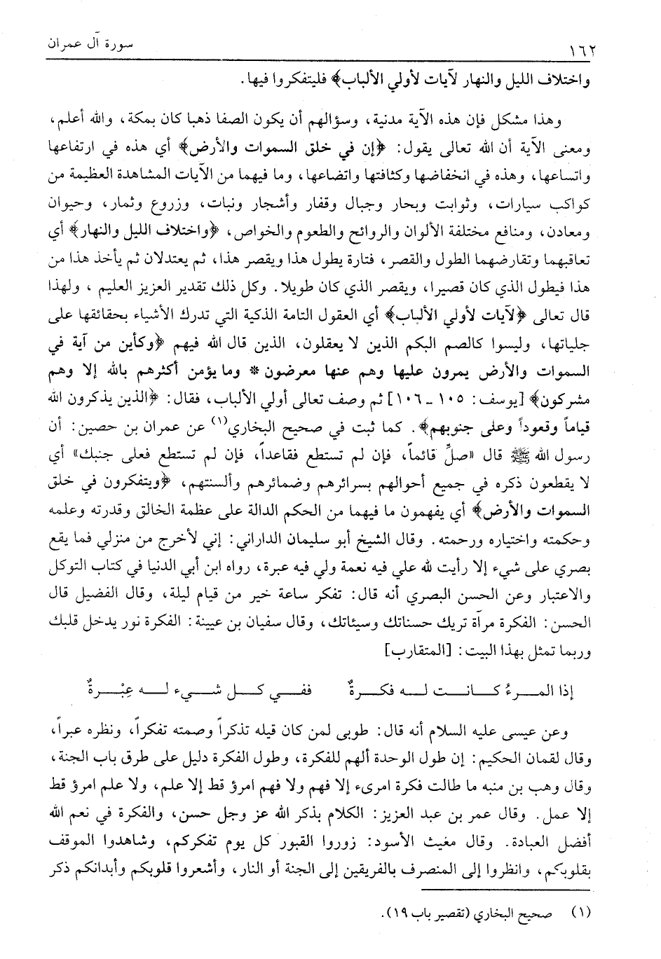 وَهَذَا مُشْكِلٌ فَإِنَّ هَذِهِ الْآيَةَ مَدَنِيَّةٌ، وَسُؤَالُهُمْ أَنْ يَكُونَ الصَّفَا ذَهَبًا كَانَ بِمَكَّةَ، والله أعلم، ومعنى الآية أن الله تعالى يقول: إِنَّ فِي خَلْقِ السَّماواتِ وَالْأَرْضِ أَيْ هَذِهِ فِي ارْتِفَاعِهَا وَاتِّسَاعِهَا، وَهَذِهِ فِي انْخِفَاضِهَا وَكَثَافَتِهَا وَاتِّضَاعِهَا، وَمَا فِيهِمَا مِنَ الْآيَاتِ الْمُشَاهَدَةِ الْعَظِيمَةِ مِنْ كَوَاكِبَ سَيَّارَاتٍ، وَثَوَابِتَ وَبِحَارٍ وَجِبَالٍ وَقِفَارٍ وَأَشْجَارٍ وَنَبَاتٍ، وَزُرُوعٍ وَثِمَارٍ، وَحَيَوَانٍ وَمَعَادِنَ، وَمَنَافِعَ مختلفة الألوان والروائح والطعوم وَالْخَوَاصِّ، وَاخْتِلافِ اللَّيْلِ وَالنَّهارِ أَيْ تَعَاقُبُهُمَا وَتَقَارُضُهُمَا الطُّولَ وَالْقِصَرَ، فَتَارَةً يَطُولُ هَذَا وَيَقْصُرُ هَذَا، ثُمَّ يَعْتَدِلَانِ ثُمَّ يَأْخُذُ هَذَا مِنْ هَذَا فَيَطُولُ الَّذِي كَانَ قَصِيرًا، وَيَقْصُرُ الَّذِي كَانَ طويلا. وكل ذلك تقدير العزيز العليم، ولهذا قال تعالى لَآياتٍ لِأُولِي الْأَلْبابِ أَيِ الْعُقُولِ التَّامَّةِ الذَّكِيَّةِ الَّتِي تُدْرِكُ الْأَشْيَاءَ بِحَقَائِقِهَا عَلَى جَلِيَّاتِهَا، وَلَيْسُوا كَالصُّمِّ الْبُكْمِ الَّذِينَ لَا يَعْقِلُونَ، الَّذِينَ قَالَ اللَّهُ فِيهِمْ وَكَأَيِّنْ مِنْ آيَةٍ فِي السَّماواتِ وَالْأَرْضِ يَمُرُّونَ عَلَيْها وَهُمْ عَنْها مُعْرِضُونَ وَما يُؤْمِنُ أَكْثَرُهُمْ بِاللَّهِ إِلَّا وَهُمْ مُشْرِكُونَ [يُوسُفَ: 105- 106] ثُمَّ وَصَفَ تَعَالَى أُولِي الْأَلْبَابِ، فَقَالَ: الَّذِينَ يَذْكُرُونَ اللَّهَ قِياماً وَقُعُوداً وَعَلى جُنُوبِهِمْ. كَمَا ثَبَتَ فِي صَحِيحِ الْبُخَارِيِّ «1» عَنْ عِمْرَانَ بْنِ حُصَيْنٍ: أَنَّ رَسُولَ اللَّهِ صَلَّى اللَّهُ عَلَيْهِ وَسَلَّمَ قَالَ «صَلِّ قَائِمًا، فَإِنْ لَمْ تَسْتَطِعْ فَقَاعِدًا، فَإِنْ لَمْ تَسْتَطِعْ فَعَلَى جَنْبِكَ» أَيْ لَا يَقْطَعُونَ ذِكْرَهُ فِي جَمِيعِ أَحْوَالِهِمْ بِسَرَائِرِهِمْ وَضَمَائِرِهِمْ وَأَلْسِنَتِهِمْ، وَيَتَفَكَّرُونَ فِي خَلْقِ السَّماواتِ وَالْأَرْضِ أَيْ يَفْهَمُونَ مَا فِيهِمَا مِنَ الْحِكَمِ الدَّالَّةِ عَلَى عَظَمَةِ الْخَالِقِ وَقُدْرَتِهِ وَعِلْمِهِ وَحِكْمَتِهِ وَاخْتِيَارِهِ وَرَحْمَتِهِ. وَقَالَ الشَّيْخُ أَبُو سُلَيْمَانَ الدَّارَانِيُّ: إِنِّي لَأَخْرُجُ مِنْ مَنْزِلِي فَمَا يَقَعُ بَصَرِي عَلَى شَيْءٍ إلا رأيت لله علي فيه نعمة ولي فِيهِ عِبْرَةٌ، رَوَاهُ ابْنُ أَبِي الدُّنْيَا فِي كتاب التوكل وَالِاعْتِبَارِ وَعَنِ الْحَسَنِ الْبَصْرِيِّ أَنَّهُ قَالَ: تَفَكُّرُ سَاعَةٍ خَيْرٌ مِنْ قِيَامِ لَيْلَةٍ، وَقَالَ الْفُضَيْلُ قَالَ الْحَسَنُ: الْفِكْرَةُ مِرْآةٌ تُرِيكَ حَسَنَاتِكَ وَسَيِّئَاتِكَ، وَقَالَ سُفْيَانُ بْنُ عُيَيْنَةَ: الْفِكْرَةُ نُورٌ يَدْخُلُ قلبك وربما تمثل بهذا البيت: [المتقارب]
