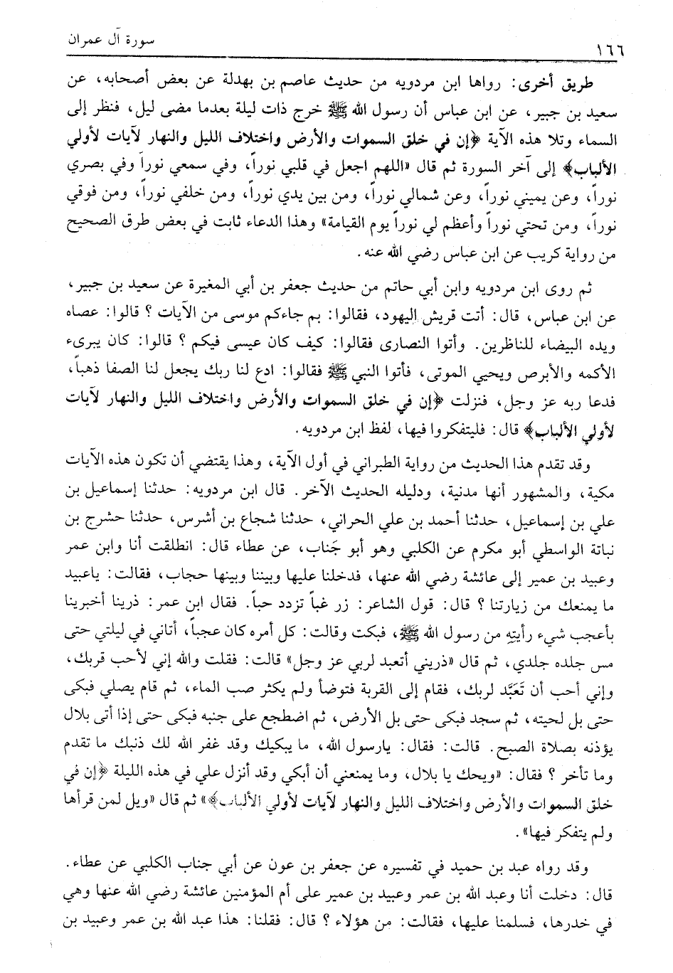 طَرِيقٌ أُخْرَى: رَوَاهَا ابْنُ مَرْدَوَيْهِ مِنْ حَدِيثِ عَاصِمِ بْنِ بَهْدَلَةَ عَنْ بَعْضِ أَصْحَابِهِ، عَنْ سَعِيدِ بْنِ جُبَيْرٍ، عَنِ ابْنِ عَبَّاسٍ أن رَسُولَ اللَّهِ صَلَّى اللَّهُ عَلَيْهِ وَسَلَّمَ خَرَجَ ذَاتَ لَيْلَةٍ بَعْدَ مَا مَضَى لَيْلٌ، فَنَظَرَ إِلَى السَّمَاءِ وَتَلَا هَذِهِ الْآيَةَ إِنَّ فِي خَلْقِ السَّماواتِ وَالْأَرْضِ وَاخْتِلافِ اللَّيْلِ وَالنَّهارِ لَآياتٍ لِأُولِي الْأَلْبابِ إِلَى آخِرِ السُّورَةِ ثُمَّ قَالَ «اللَّهُمَّ اجْعَلْ فِي قَلْبِي نُورًا، وَفِي سَمْعِي نُورًا وَفِي بَصَرِي نُورًا، وَعَنْ يَمِينِي نُورًا، وَعَنْ شِمَالِي نُورًا، وَمِنْ بَيْنِ يَدَيَّ نُورًا، وَمِنْ خَلْفِي نُورًا، وَمِنْ فَوْقِي نُورًا، وَمِنْ تَحْتِي نُورًا وَأَعْظِمْ لِي نُورًا يَوْمَ الْقِيَامَةِ» وَهَذَا الدُّعَاءُ ثَابِتٌ فِي بَعْضِ طُرُقِ الصَّحِيحِ مِنْ رِوَايَةِ كُرَيْبٍ عَنِ ابْنِ عَبَّاسٍ رَضِيَ اللَّهُ عَنْهُ.