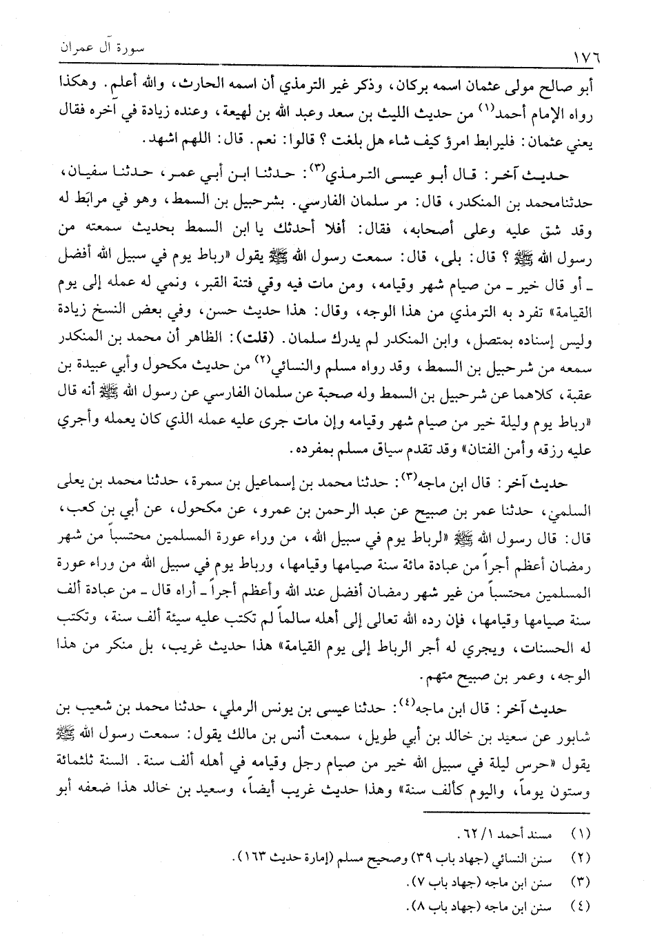 حَدِيثٌ آخَرُ: قَالَ أَبُو عِيسَى التِّرْمِذِيُّ «2» : حَدَّثَنَا ابْنُ أَبِي عُمَرَ، حَدَّثَنَا سُفْيَانُ، حَدَّثَنَا مُحَمَّدُ بْنُ الْمُنْكَدِرِ، قَالَ: مَرَّ سَلْمَانُ الْفَارِسِيُّ. بِشُرَحْبِيلَ بْنِ السِّمْطِ، وَهُوَ فِي مُرَابَطٍ لَهُ وَقَدْ شَقَّ عَلَيْهِ وَعَلَى أصحابه، فقال: أفلا أحدثكم يَا ابْنَ السِّمْطِ بِحَدِيثٍ سَمِعْتُهُ مِنْ رَسُولِ اللَّهِ صَلَّى اللَّهُ عَلَيْهِ وَسَلَّمَ؟ قَالَ: بَلَى، قَالَ: سَمِعْتُ رَسُولَ اللَّهِ صَلَّى اللَّهُ عَلَيْهِ وَسَلَّمَ يَقُولُ «رِبَاطُ يَوْمٍ فِي سَبِيلِ اللَّهِ أَفْضَلُ- أَوْ قَالَ خَيْرٌ- مِنْ صِيَامِ شَهْرٍ وَقِيَامِهِ، وَمَنْ مَاتَ فِيهِ وُقِيَ فِتْنَةَ الْقَبْرِ، ونمي لَهُ عَمَلُهُ إِلَى يَوْمِ الْقِيَامَةِ» تَفَرَّدَ بِهِ التِّرْمِذِيُّ مِنْ هَذَا الْوَجْهِ، وَقَالَ: هَذَا حَدِيثٌ حَسَنٌ، وَفِي بَعْضِ النُّسَخِ زِيَادَةٌ وَلَيْسَ إِسْنَادُهُ بِمُتَّصِلٍ، وَابْنُ الْمُنْكَدِرِ لَمْ يُدْرِكْ سَلْمَانَ. (قُلْتُ) : الظَّاهِرُ أَنَّ مُحَمَّدَ بْنَ الْمُنْكَدِرِ سَمِعَهُ مِنْ شُرَحْبِيلَ بْنِ السِّمْطِ، وَقَدْ رَوَاهُ مُسْلِمٌ وَالنَّسَائِيُّ «3» مِنْ حَدِيثِ مَكْحُولٍ وَأَبِي عُبَيْدَةَ بْنِ عُقْبَةَ، كِلَاهُمَا عَنْ شُرَحْبِيلَ بْنِ السِّمْطِ وَلَهُ صُحْبَةٌ عَنْ سَلْمَانَ الْفَارِسِيِّ عَنْ رَسُولِ اللَّهِ صَلَّى اللَّهُ عَلَيْهِ وَسَلَّمَ أَنَّهُ قَالَ «رِبَاطُ يَوْمٍ وَلَيْلَةٍ خَيْرٌ مِنْ صِيَامِ شَهْرٍ وَقِيَامِهِ وَإِنْ مَاتَ جَرَى عَلَيْهِ عَمَلُهُ الَّذِي كَانَ يَعْمَلُهُ وَأُجْرِيَ عَلَيْهِ رِزْقُهُ وَأَمِنَ الْفَتَّانَ» وَقَدْ تَقَدَّمَ سِيَاقُ مُسْلِمٍ بِمُفْرَدِهِ.