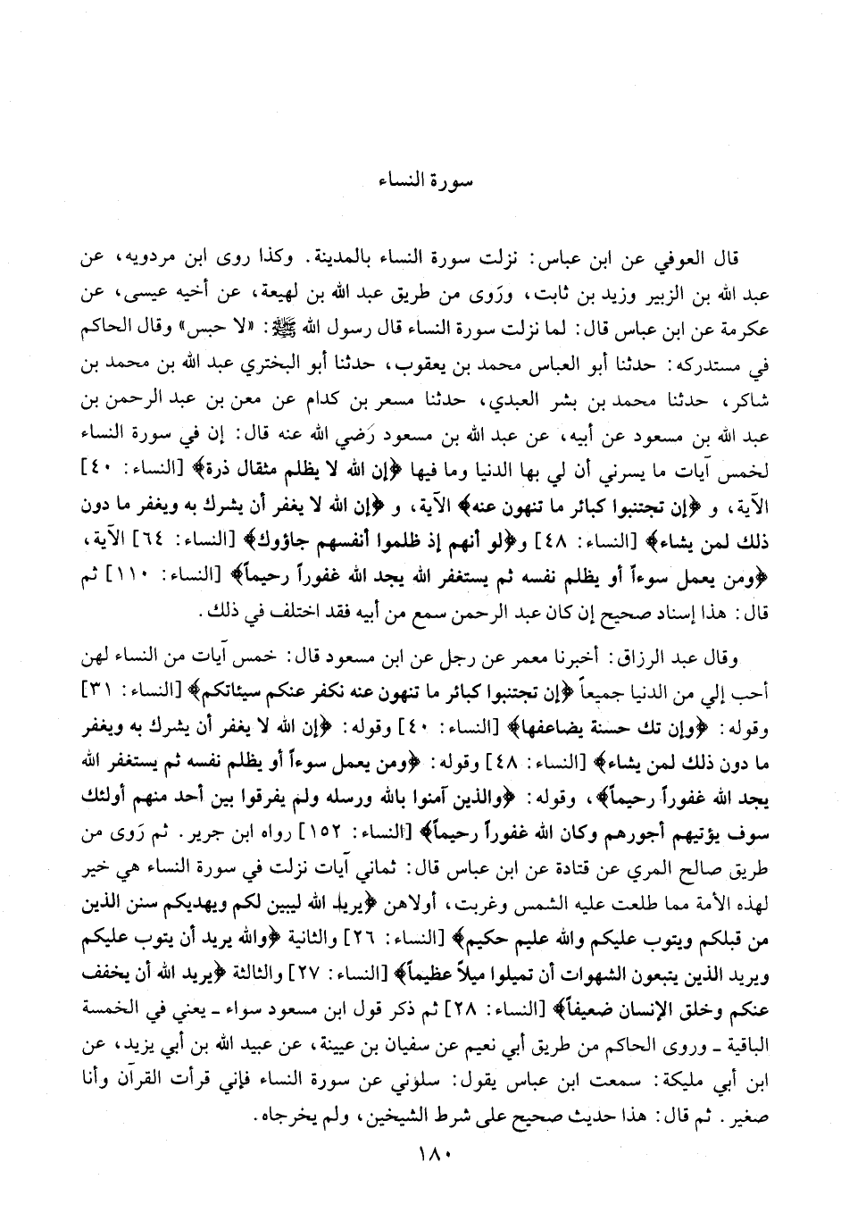 قَالَ الْعَوْفِيُّ عَنِ ابْنِ عَبَّاسٍ: نَزَلَتْ سُورَةُ النِّسَاءِ بِالْمَدِينَةِ. وَكَذَا رَوَى ابْنُ مَرْدَوَيْهِ، عَنْ عَبْدِ اللَّهِ بْنِ الزُّبَيْرِ وَزَيْدِ بْنِ ثَابِتٍ، وَرَوَى مِنْ طَرِيقِ عَبْدِ اللَّهِ بْنِ لَهِيعَةَ، عَنِ أَخِيهِ عِيسَى، عَنْ عِكْرِمَةَ عَنِ ابْنِ عَبَّاسٍ قَالَ: لَمَّا نَزَلَتْ سُورَةُ النِّسَاءِ قَالَ رَسُولُ اللَّهِ صَلَّى اللَّهُ عَلَيْهِ وَسَلَّمَ: «لا حَبْسَ» وَقَالَ الْحَاكِمُ فِي مُسْتَدْرَكِهِ: حَدَّثَنَا أَبُو الْعَبَّاسِ مُحَمَّدُ بْنُ يَعْقُوبَ، حَدَّثَنَا أَبُو الْبَخْتَرِيِّ عَبْدُ اللَّهِ بْنُ مُحَمَّدِ بْنِ شَاكِرٍ، حَدَّثَنَا مُحَمَّدُ بْنُ بِشْرٍ الْعَبْدِيُّ، حَدَّثَنَا مِسْعَرُ بْنُ كِدَامٍ عَنْ مَعْنِ بْنِ عَبْدِ الرَّحْمَنِ بْنِ عَبْدِ اللَّهِ بْنِ مَسْعُودٍ عَنْ أَبِيهِ، عَنْ عَبْدِ اللَّهِ بْنِ مَسْعُودٍ رَضِيَ اللَّهُ عَنْهُ قَالَ: إِنَّ فِي سُورَةِ النِّسَاءِ لَخَمْسَ آيَاتٍ مَا يَسُرُّنِي أَنَّ لِي بِهَا الدُّنْيَا وَمَا فِيهَا إِنَّ اللَّهَ لَا يَظْلِمُ مِثْقالَ ذَرَّةٍ [النساء: 40] الآية، وإِنْ تَجْتَنِبُوا كَبائِرَ ما تُنْهَوْنَ عَنْهُ الآية، وإِنَّ اللَّهَ لَا يَغْفِرُ أَنْ يُشْرَكَ بِهِ وَيَغْفِرُ ما دُونَ ذلِكَ لِمَنْ يَشاءُ [النساء: 48] ولَوْ أَنَّهُمْ إِذْ ظَلَمُوا أَنْفُسَهُمْ جاؤُكَ [النساء: 64] الآية، وَمَنْ يَعْمَلْ سُوءاً أَوْ يَظْلِمْ نَفْسَهُ ثُمَّ يَسْتَغْفِرِ اللَّهَ يَجِدِ اللَّهَ غَفُوراً رَحِيماً