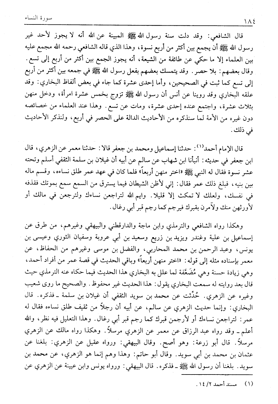 قَالَ الشَّافِعِيُّ: وَقَدْ دَلَّتْ سُنَّةُ رَسُولِ اللَّهِ صَلَّى اللَّهُ عَلَيْهِ وَسَلَّمَ الْمُبِيِّنَةُ عَنِ اللَّهِ أَنَّهُ لَا يَجُوزُ لِأَحَدٍ غَيْرِ رَسُولِ اللَّهِ صَلَّى اللَّهُ عَلَيْهِ وَسَلَّمَ أَنْ يَجْمَعَ بَيْنَ أَكْثَرَ مِنْ أَرْبَعِ نِسْوَةٍ، وَهَذَا الَّذِي قَالَهُ الشَّافِعِيُّ رَحِمَهُ اللَّهُ مُجْمَعٌ عَلَيْهِ بَيْنَ الْعُلَمَاءِ إِلَّا مَا حُكِيَ عَنْ طَائِفَةٍ مِنَ الشِّيعَةِ، أَنَّهُ يَجُوزُ الْجَمْعُ بَيْنَ أَكْثَرَ مِنْ أَرْبَعٍ إِلَى تِسْعٍ.