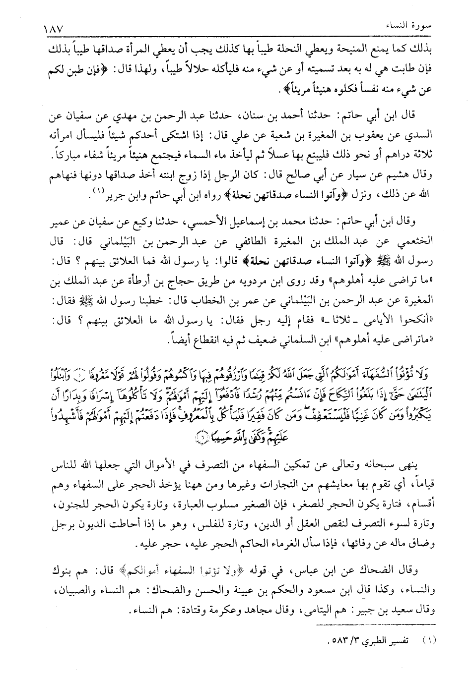 وَلا تُؤْتُوا السُّفَهاءَ أَمْوالَكُمُ الَّتِي جَعَلَ اللَّهُ لَكُمْ قِياماً وَارْزُقُوهُمْ فِيها وَاكْسُوهُمْ وَقُولُوا لَهُمْ قَوْلاً مَعْرُوفاً (5) وَابْتَلُوا الْيَتامى حَتَّى إِذا بَلَغُوا النِّكاحَ فَإِنْ آنَسْتُمْ مِنْهُمْ رُشْداً فَادْفَعُوا إِلَيْهِمْ أَمْوالَهُمْ وَلا تَأْكُلُوها إِسْرافاً وَبِداراً أَنْ يَكْبَرُوا وَمَنْ كانَ غَنِيًّا فَلْيَسْتَعْفِفْ وَمَنْ كانَ فَقِيراً فَلْيَأْكُلْ بِالْمَعْرُوفِ فَإِذا دَفَعْتُمْ إِلَيْهِمْ أَمْوالَهُمْ فَأَشْهِدُوا عَلَيْهِمْ وَكَفى بِاللَّهِ حَسِيباً (6)