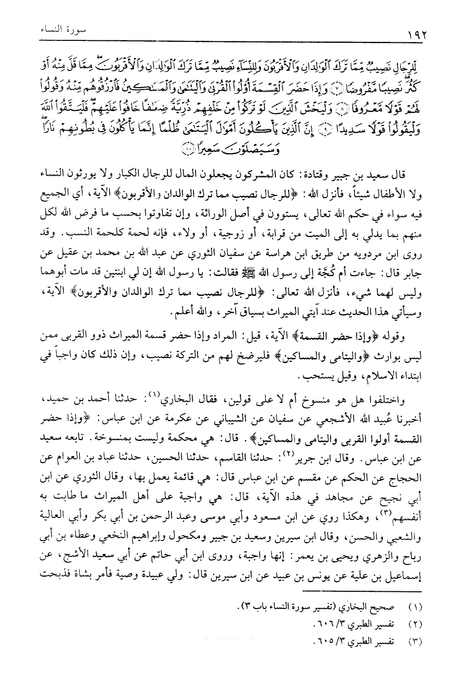 وَاخْتَلَفُوا هَلْ هُوَ مَنْسُوخٌ أَمْ لَا عَلَى قَوْلَيْنِ، فَقَالَ الْبُخَارِيُّ «1» : حَدَّثَنَا أَحْمَدُ بْنُ حُمَيْدٍ، أَخْبَرَنَا عُبَيْدُ اللَّهِ الْأَشْجَعِيُّ عَنْ سُفْيَانَ عَنِ الشَّيْبَانِيِّ عَنْ عِكْرِمَةَ عَنِ ابْنِ عَبَّاسٍ: وَإِذا حَضَرَ الْقِسْمَةَ أُولُوا الْقُرْبى وَالْيَتامى وَالْمَساكِينُ. قَالَ: هِيَ مُحْكَمَةٌ وَلَيْسَتْ بِمَنْسُوخَةٍ. تَابَعَهُ سَعِيدٌ عَنِ ابْنِ عَبَّاسٍ. وَقَالَ ابْنُ جَرِيرٍ «2» : حَدَّثَنَا الْقَاسِمُ، حَدَّثَنَا الْحُسَيْنُ، حَدَّثَنَا عَبَّادُ بْنُ الْعَوَّامِ عَنِ الْحَجَّاجِ عَنِ الْحَكَمِ عَنْ مِقْسَمٍ عَنِ ابْنِ عَبَّاسٍ قَالَ: هِيَ قَائِمَةٌ يَعْمَلُ بِهَا، وَقَالَ الثَّوْرِيُّ عَنِ ابْنِ أَبِي نَجِيحٍ عَنْ مُجَاهِدٍ فِي هَذِهِ الْآيَةِ، قَالَ: هِيَ وَاجِبَةٌ عَلَى أَهْلِ الْمِيرَاثِ مَا طَابَتْ بِهِ أَنْفُسُهُمْ «3» ، وَهَكَذَا رُوِيَ عَنِ ابْنِ مَسْعُودٍ وَأَبِي مُوسَى وَعَبْدِ الرَّحْمَنِ بْنِ أَبِي بَكْرٍ وَأَبِي الْعَالِيَةِ وَالشَّعْبِيِّ وَالْحَسَنِ، وقال ابن سِيرِينَ وَسَعِيدِ بْنِ جُبَيرٍ وَمَكْحُولٍ وَإِبْرَاهِيمَ النَّخَعِيِّ وَعَطَاءِ بْنِ أَبِي رَبَاحٍ وَالزُّهْرِيِّ وَيَحْيَى بْنِ يَعْمُرَ: إِنَّهَا وَاجِبَةٌ، وَرَوَى ابْنُ أَبِي حَاتِمٍ عَنْ أَبِي سَعِيدٍ الْأَشَجِّ، عَنِ اسْمَاعِيلَ بْنِ علية عن يونس بن عبيد عن ابن سِيرِينَ قَالَ: وَلِيَ عُبَيْدَةُ وَصِيَّةً فَأَمَرَ بِشَاةٍ فذبحت
