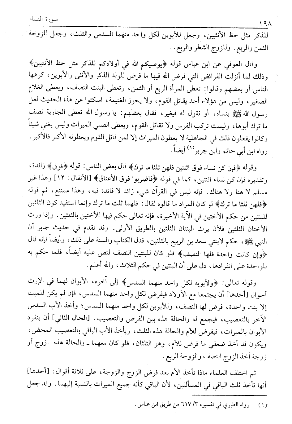 وقوله تعالى: وَلِأَبَوَيْهِ لِكُلِّ واحِدٍ مِنْهُمَا السُّدُسُ إلى آخره، الأبوان لهما في الإرث أَحْوَالٌ [أَحَدُهَا] أَنْ يَجْتَمِعَا مَعَ الْأَوْلَادِ فَيُفْرَضُ لِكُلِّ وَاحِدٍ مِنْهُمَا السُّدُسُ، فَإِنْ لَمْ يَكُنْ لِلْمَيِّتِ إِلَّا بِنْتٌ وَاحِدَةٌ، فُرِضَ لَهَا النِّصْفُ، وَلِلْأَبَوَيْنِ لِكُلِّ وَاحِدٍ مِنْهُمَا السُّدُسُ وَأَخَذَ الْأَبُ السُّدُسَ الْآخَرَ بِالتَّعْصِيبِ، فَيُجْمَعُ لَهُ وَالْحَالَةُ هَذِهِ بين الْفَرْضُ وَالتَّعْصِيبُ. [الْحَالُ الثَّانِي] أَنْ يَنْفَرِدَ الْأَبَوَانِ بِالْمِيرَاثِ، فَيُفْرَضُ لِلْأُمِّ وَالْحَالَةُ هَذِهِ الثُّلُثُ، وَيَأْخُذُ الْأَبُ الْبَاقِي بِالتَّعْصِيبِ الْمَحْضِ، وَيَكُونُ قَدْ أَخَذَ ضَعْفَيِ مَا فُرِضَ لِلْأُمِّ، وَهُوَ الثُّلُثَانِ، فَلَوْ كَانَ مَعَهُمَا- وَالْحَالَةُ هَذِهِ- زَوْجٌ أَوْ زَوْجَةٌ أَخَذَ الزَّوْجُ النِّصْفَ وَالزَّوْجَةُ الرُّبُعَ.