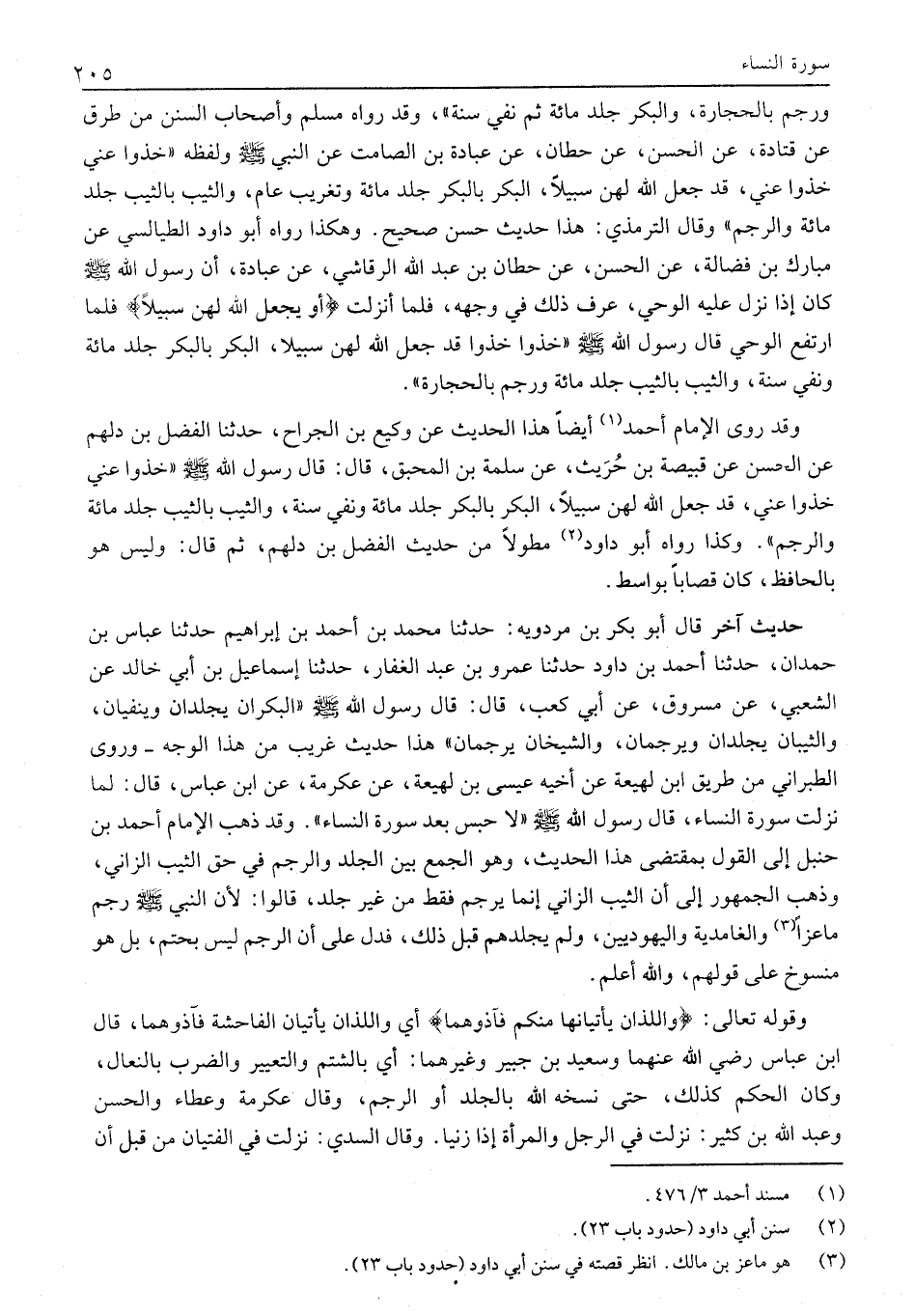 وَرَجْمٌ بِالْحِجَارَةِ، وَالْبِكْرُ جَلْدُ مِائَةٍ ثُمَّ نَفْيُ سَنَةٍ» ، وَقَدْ رَوَاهُ مُسْلِمٌ وَأَصْحَابُ السُّنَنِ مِنْ طُرُقٍ عَنْ قَتَادَةَ، عَنِ الْحَسَنِ، عَنْ حِطَّانَ، عَنْ عُبَادَةَ بْنِ الصَّامِتِ عَنِ النَّبِيِّ صَلَّى اللَّهُ عَلَيْهِ وَسَلَّمَ وَلَفْظُهُ «خُذُوا عَنِّي خُذُوا عَنِّي، قَدْ جَعَلَ اللَّهُ لَهُنَّ سَبِيلًا، الْبِكْرُ بِالْبِكْرِ جَلْدُ مِائَةٍ وَتَغْرِيبُ عَامٍ، وَالثَّيِّبُ بِالثَّيِّبِ جَلْدُ مِائَةٍ وَالرَّجْمُ» وَقَالَ التِّرْمِذِيُّ: هَذَا حَدِيثٌ حَسَنٌ صَحِيحٌ. وَهَكَذَا رَوَاهُ أَبُو دَاوُدَ الطَّيَالِسِيُّ عَنْ مُبَارَكِ بْنِ فَضَالَةَ، عَنِ الْحَسَنِ، عَنْ حِطَّانَ بْنِ عَبْدِ اللَّهِ الرَّقَاشِيِّ، عَنْ عُبَادَةَ، أَنَّ رَسُولَ اللَّهِ صَلَّى اللَّهُ عَلَيْهِ وَسَلَّمَ كَانَ إِذَا نَزَلَ عَلَيْهِ الْوَحْيُ، عُرِفَ ذَلِكَ فِي وَجْهِهِ، فَلَمَّا أُنْزِلَتْ أَوْ يَجْعَلَ اللَّهُ لَهُنَّ سَبِيلًا فلما ارْتَفَعَ الْوَحْيُ قَالَ رَسُولُ اللَّهِ صَلَّى اللَّهُ عَلَيْهِ وَسَلَّمَ «خُذُوا قَدْ جَعَلَ اللَّهُ لَهُنَّ سَبِيلًا، الْبِكْرُ بِالْبِكْرِ جَلْدُ مِائَةٍ وَنَفْيُ سَنَةٍ، وَالثَّيِّبُ بِالثَّيِّبِ جَلْدُ مِائَةٍ وَرَجْمٌ بِالْحِجَارَةِ» .
