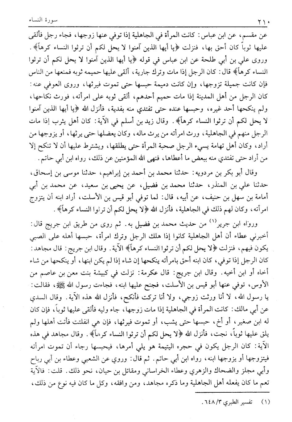 وَرَوَى عَلِيُّ بْنُ أَبِي طَلْحَةَ عَنِ ابْنِ عَبَّاسٍ فِي قَوْلُهُ يَا أَيُّهَا الَّذِينَ آمَنُوا لَا يَحِلُّ لَكُمْ أَنْ تَرِثُوا النِّساءَ كَرْهاً قَالَ: كَانَ الرَّجُلُ إِذَا مَاتَ وَتَرَكَ جَارِيَةً، أَلْقَى عَلَيْهَا حَمِيمُهُ ثَوْبَهُ فَمَنَعَهَا مِنَ النَّاسِ فَإِنْ كَانَتْ جَمِيلَةً تَزَوَّجَهَا، وَإِنْ كَانَتْ دَمِيمَةً حَبَسَهَا حَتَّى تَمُوتَ فَيَرِثُهَا، وَرَوَى الْعَوْفِيُّ عَنْهُ: