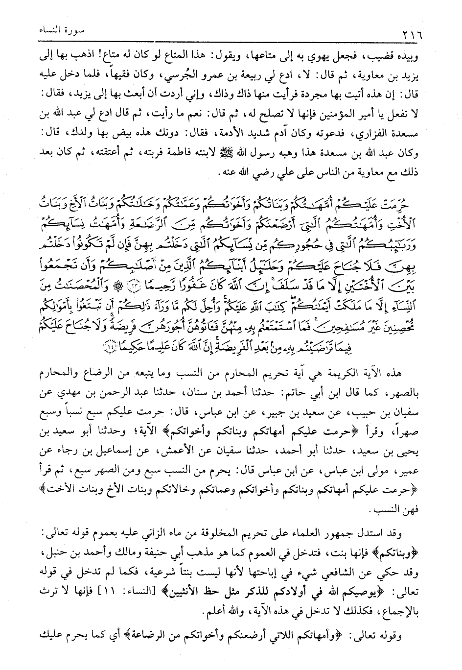 هَذِهِ الْآيَةُ الْكَرِيمَةُ هِيَ آيَةُ تَحْرِيمِ الْمَحَارِمِ مِنَ النَّسَبِ وَمَا يَتْبَعُهُ مِنَ الرَّضَاعِ وَالْمَحَارِمِ بِالصِّهْرِ، كَمَا قَالَ ابْنُ أَبِي حَاتِمٍ: حَدَّثَنَا أَحْمَدُ بْنُ سِنَانٍ، حَدَّثَنَا عَبْدُ الرَّحْمَنِ بْنُ مَهْدِيٍّ عَنْ سُفْيَانَ بْنِ حَبِيبٍ، عَنْ سَعِيدِ بْنِ جُبَيْرٍ، عَنِ ابْنِ عَبَّاسٍ، قَالَ: حُرِّمَتْ عَلَيْكُمْ سَبْعٌ نَسَبًا وَسَبْعٌ صِهْرًا، وَقَرَأَ حُرِّمَتْ عَلَيْكُمْ أُمَّهاتُكُمْ وَبَناتُكُمْ وَأَخَواتُكُمْ الْآيَةَ وَحَدَّثَنَا أَبُو سَعِيدِ بْنِ يَحْيَى بْنِ سَعِيدٍ، حَدَّثَنَا أَبُو أَحْمَدَ، حَدَّثَنَا سُفْيَانُ عَنِ الْأَعْمَشِ، عن إسماعيل بن رجاء عَنْ عُمَيْرٍ، مَوْلَى ابْنِ عَبَّاسٍ، عَنِ ابْنِ عَبَّاسٍ قَالَ: يَحْرُمُ مِنَ النَّسَبِ سَبْعٌ وَمِنَ الصِّهْرِ سَبْعٌ، ثُمَّ قَرَأَ حُرِّمَتْ عَلَيْكُمْ أُمَّهاتُكُمْ وَبَناتُكُمْ وَأَخَواتُكُمْ وَعَمَّاتُكُمْ وَخالاتُكُمْ وَبَناتُ الْأَخِ وَبَناتُ الْأُخْتِ فَهُنَّ النَّسَبُ.