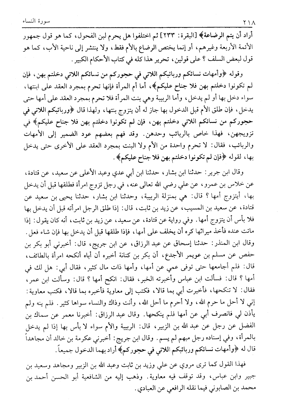 وَقَوْلُهُ وَأُمَّهاتُ نِسائِكُمْ وَرَبائِبُكُمُ اللَّاتِي فِي حُجُورِكُمْ مِنْ نِسائِكُمُ اللَّاتِي دَخَلْتُمْ بِهِنَّ، فَإِنْ لَمْ تَكُونُوا دَخَلْتُمْ بِهِنَّ فَلا جُناحَ عَلَيْكُمْ، أَمَّا أَمُّ الْمَرْأَةِ فَإِنَّهَا تَحْرُمُ بِمُجَرَّدِ الْعَقْدِ عَلَى ابْنَتِهَا، سَوَاءٌ دَخَلَ بِهَا أَوْ لَمْ يَدْخُلْ، وَأَمَّا الرَّبِيبَةُ وَهِيَ بِنْتُ الْمَرْأَةِ فَلَا تَحْرُمُ بِمُجَرَّدِ الْعَقْدِ عَلَى أمها حتى يدخل، فَإِنْ طَلَّقَ الْأُمَّ قَبْلَ الدُّخُولِ بِهَا جَازَ لَهُ أَنْ يَتَزَوَّجَ بِنْتَهَا، وَلِهَذَا قَالَ وَرَبائِبُكُمُ اللَّاتِي فِي حُجُورِكُمْ مِنْ نِسائِكُمُ اللَّاتِي دَخَلْتُمْ بِهِنَّ، فَإِنْ لَمْ تَكُونُوا دَخَلْتُمْ بِهِنَّ فَلا جُناحَ عَلَيْكُمْ فِي تَزْوِيجِهِنَّ، فَهَذَا خَاصٌّ بِالرَّبَائِبِ وَحْدَهُنَّ. وَقَدْ فهم بعضهم عود الضمير إلى الأمهات والربائب، فَقَالَ: لَا تَحْرُمُ وَاحِدَةٌ مِنَ الْأُمِّ وَلَا الْبِنْتِ بِمُجَرَّدِ الْعَقْدِ عَلَى الْأُخْرَى حَتَّى يَدْخُلَ بِهَا، لِقَوْلِهِ فَإِنْ لَمْ تَكُونُوا دَخَلْتُمْ بِهِنَّ فَلا جُناحَ عَلَيْكُمْ.