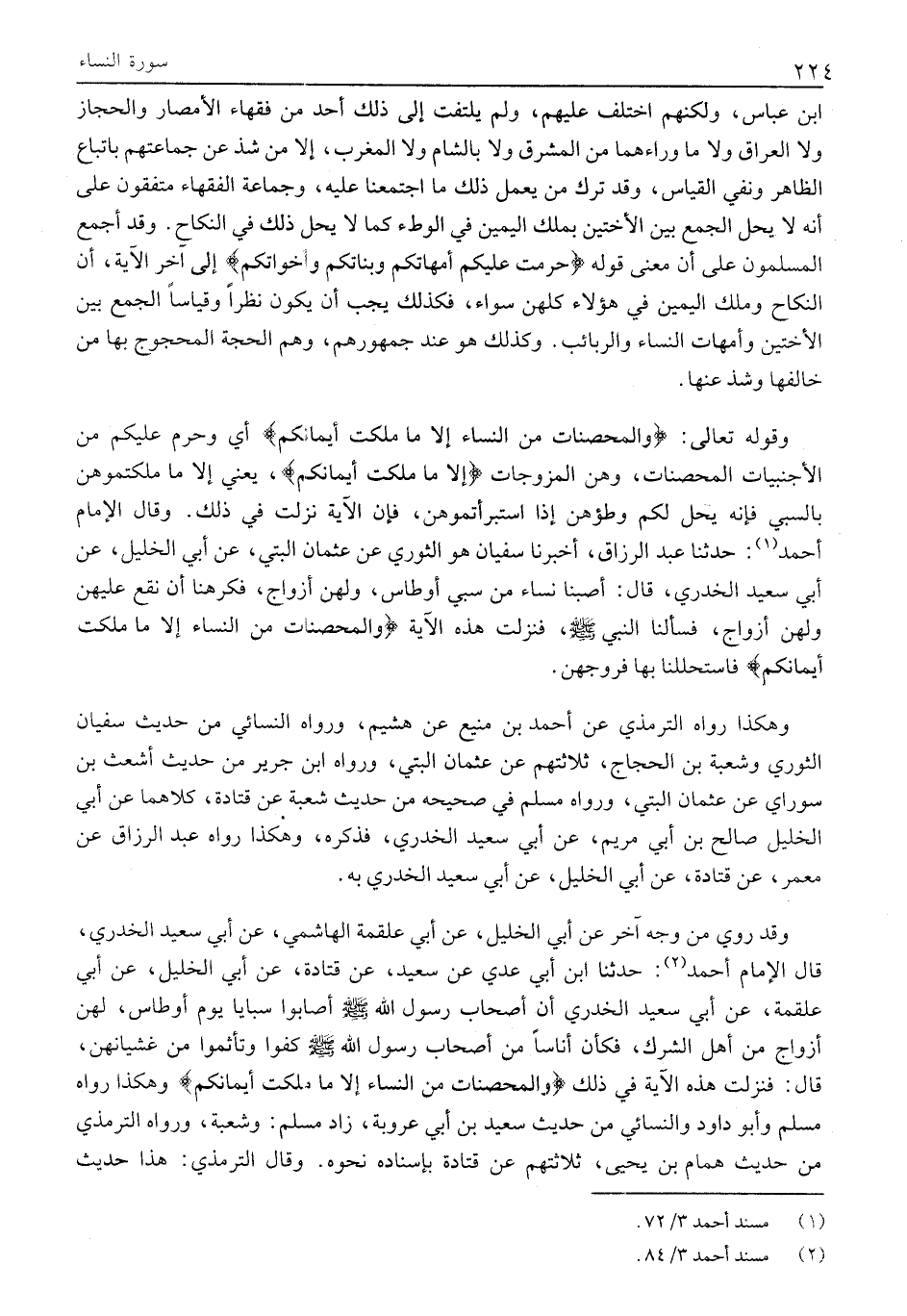 وَقَوْلُهُ تَعَالَى: وَالْمُحْصَناتُ مِنَ النِّساءِ إِلَّا مَا مَلَكَتْ أَيْمانُكُمْ أي وحرم عليكم من الْأَجْنَبِيَّاتُ الْمُحْصَنَاتُ، وَهُنَّ الْمُزَوَّجَاتُ إِلَّا مَا مَلَكَتْ أَيْمانُكُمْ، يَعْنِي إِلَّا مَا مَلَكْتُمُوهُنَّ بِالسَّبْيِ فَإِنَّهُ يَحِلُّ لَكُمْ وَطْؤُهُنَّ إِذَا اسْتَبْرَأْتُمُوهُنَّ، فَإِنَّ الْآيَةَ نزلت في ذلك. وَقَالَ الْإِمَامُ أَحْمَدُ «1» : حَدَّثَنَا عَبْدُ الرَّزَّاقِ، أَخْبَرَنَا سُفْيَانُ هُوَ الثَّوْرِيُّ عَنْ عُثْمَانَ الْبَتِّيِّ، عَنْ أَبِي الْخَلِيلِ، عَنْ أَبِي سَعِيدٍ الْخُدْرِيِّ، قَالَ: أَصَبْنَا نِسَاءً مِنْ سَبْيِ أَوْطَاسَ، وَلَهُنَّ أَزْوَاجٌ، فَكَرِهْنَا أَنْ نَقَعَ عَلَيْهِنَّ وَلَهُنَّ أَزْوَاجٌ، فَسَأَلْنَا النَّبِيَّ صَلَّى اللَّهُ عَلَيْهِ وَسَلَّمَ، فَنَزَلَتْ هَذِهِ الْآيَةُ وَالْمُحْصَناتُ مِنَ النِّساءِ إِلَّا مَا مَلَكَتْ أَيْمانُكُمْ فاستحللنا بها فُرُوجَهُنَّ.