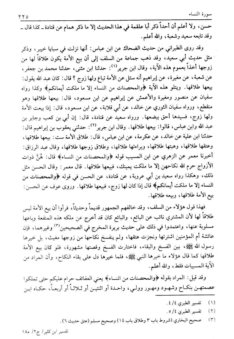 بَيْعُهَا طَلَاقُهَا. وَيَتْلُو هَذِهِ الْآيَةَ وَالْمُحْصَناتُ مِنَ النِّساءِ إِلَّا مَا مَلَكَتْ أَيْمانُكُمْ وَكَذَا رَوَاهُ سُفْيَانُ عَنْ مَنْصُورٍ وَمُغِيرَةَ وَالْأَعْمَشُ عَنْ إِبْرَاهِيمَ عَنِ ابْنِ مَسْعُودٍ، قَالَ: بَيْعُهَا طَلَاقُهَا وَهُوَ مُنْقَطِعٌ، ورواه سُفْيَانُ الثَّوْرِيُّ عَنْ خَالِدٍ، عَنْ أَبِي قِلَابَةَ، عَنِ ابْنِ مَسْعُودٍ، قَالَ: إِذَا بِيعَتِ الْأَمَةُ وَلَهَا زَوْجٌ، فَسَيِّدُهَا أَحَقُّ بِبُضْعِهَا. وَرَوَاهُ سَعِيدٌ عَنْ قَتَادَةَ، قَالَ: إِنَّ أُبَيَّ بْنَ كَعْبٍ وَجَابِرَ بْنَ عَبْدِ اللَّهِ وَابْنَ عَبَّاسٍ، قَالُوا: بَيْعُهَا طَلَاقُهَا. وَقَالَ ابْنُ جَرِيرٍ «2» : حَدَّثَنِي يَعْقُوبُ بْنُ إِبْرَاهِيمَ قال: