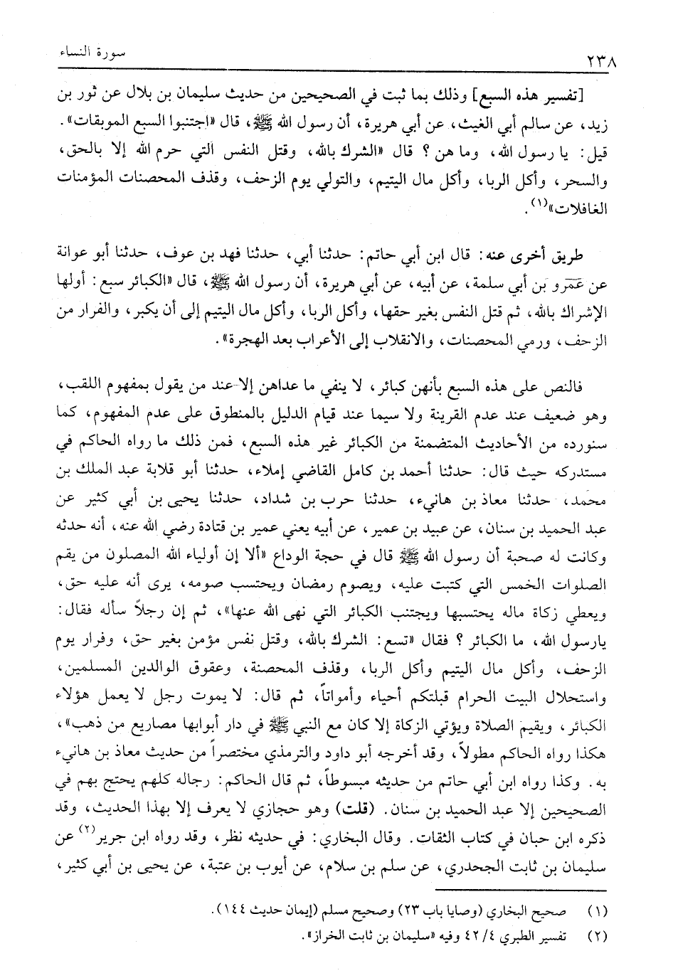 [تَفْسِيرُ هَذِهِ السَّبْعِ] وَذَلِكَ بِمَا ثَبَتَ فِي الصَّحِيحَيْنِ مِنْ حَدِيثِ سُلَيْمَانَ بْنِ بِلَالٍ عَنْ ثَوْرِ بْنِ زَيْدٍ، عَنْ سَالِمٍ أَبِي الْغَيْثِ، عَنْ أَبِي هُرَيْرَةَ، أَنَّ رَسُولَ اللَّهِ صَلَّى اللَّهُ عَلَيْهِ وَسَلَّمَ، قَالَ «اجْتَنِبُوا السَّبْعَ الْمُوبِقَاتِ» .