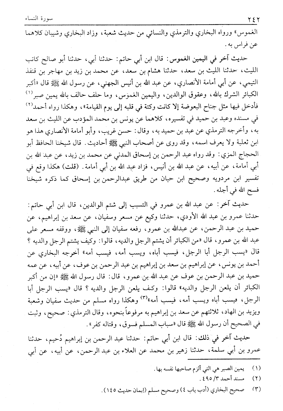 قَالَ «يَسُبُّ الرَّجُلُ أَبَا الرَّجُلِ، فَيَسُبُّ أَبَاهُ، ويسب أمه، فيسب أمه» أخرجه الْبُخَارِيُّ عَنْ أَحْمَدَ بْنِ يُونُسَ، عَنْ إِبْرَاهِيمَ بْنِ سَعْدِ بْنُ إِبْرَاهِيمَ بْنِ عَبْدِ الرَّحْمَنِ بْنِ عَوْفٍ، عَنْ أَبِيهِ، عَنْ عَمِّهِ حُمَيْدِ بْنِ عَبْدِ الرَّحْمَنِ بْنِ عَوْفٍ عَنْ عَبْدِ اللَّهِ بْنِ عَمْرٍو، قَالَ: قَالَ رَسُولُ اللَّهِ صَلَّى اللَّهُ عَلَيْهِ وَسَلَّمَ «إِنَّ مِنْ أَكْبَرِ الْكَبَائِرِ أَنْ يَلْعَنَ الرَّجُلُ وَالِدَيْهِ» قَالُوا: وَكَيْفَ يَلْعَنُ الرَّجُلُ وَالِدَيْهِ؟ قَالَ «يَسُبُّ الرَّجُلُ أَبَا الرَّجُلِ، فَيَسُبُّ أَبَاهُ وَيَسُبُّ أُمَّهُ، فَيَسُبُّ أُمَّهُ» «3» وَهَكَذَا رَوَاهُ مُسْلِمٌ مِنْ حَدِيثِ سُفْيَانَ وَشُعْبَةَ وَيَزِيدَ بْنِ الْهَادِ، ثَلَاثَتُهُمْ عَنْ سَعْدِ بْنِ إبراهيم بن مَرْفُوعًا بِنَحْوِهِ، وَقَالَ التِّرْمِذِيُّ: صَحِيحٌ، وَثَبَتَ فِي الصَّحِيحِ أَنَّ رَسُولَ اللَّهِ صَلَّى اللَّهُ عَلَيْهِ وَسَلَّمَ قَالَ «سِبَابُ الْمُسْلِمِ فُسُوقٌ، وَقِتَالُهُ كُفْرٌ» .