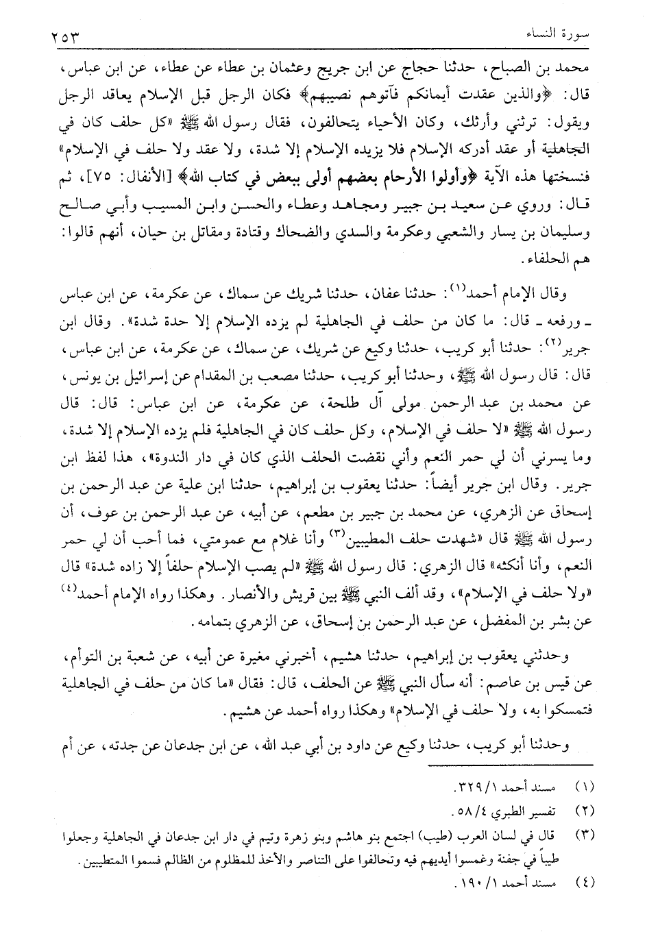 مُحَمَّدِ بْنِ الصَّبَّاحِ، حَدَّثَنَا حَجَّاجٌ عَنِ ابْنِ جُرَيْجٍ وَعُثْمَانَ بْنِ عَطَاءٍ عَنْ عَطَاءٍ، عَنِ ابْنِ عَبَّاسٍ، قَالَ: وَالَّذِينَ عَقَدَتْ أَيْمانُكُمْ فَآتُوهُمْ نَصِيبَهُمْ فَكَانَ الرَّجُلُ قَبْلَ الْإِسْلَامِ يُعَاقِدُ الرَّجُلَ ويقول: تَرِثُنِي وَأَرِثُكَ، وَكَانَ الْأَحْيَاءُ يَتَحَالَفُونَ، فَقَالَ رَسُولُ اللَّهِ صَلَّى اللَّهُ عَلَيْهِ وَسَلَّمَ «كُلُّ حِلْفٍ كَانَ فِي الْجَاهِلِيَّةِ أَوْ عَقْدٍ أَدْرَكَهُ الْإِسْلَامُ فَلَا يَزِيدُهُ الْإِسْلَامُ إِلَّا شِدَّةً، وَلَا عَقْدَ وَلَا حِلْفَ فِي الْإِسْلَامِ» فَنَسَخَتْهَا هَذِهِ الْآيَةُ وَأُولُوا الْأَرْحامِ بَعْضُهُمْ أَوْلى بِبَعْضٍ فِي كِتابِ اللَّهِ [الْأَنْفَالِ: 75] ، ثُمَّ قَالَ: وَرُوِيَ عَنْ سَعِيدِ بن جبير ومجاهد وعطاء والحسن وابن المسيب وأبي صالح وسليمان بن يسار والشعبي وَعِكْرِمَةَ والسُّدِّيِّ وَالضَّحَّاكِ وَقَتَادَةَ وَمُقَاتِلِ بْنِ حَيَّانَ، أَنَّهُمْ قَالُوا: