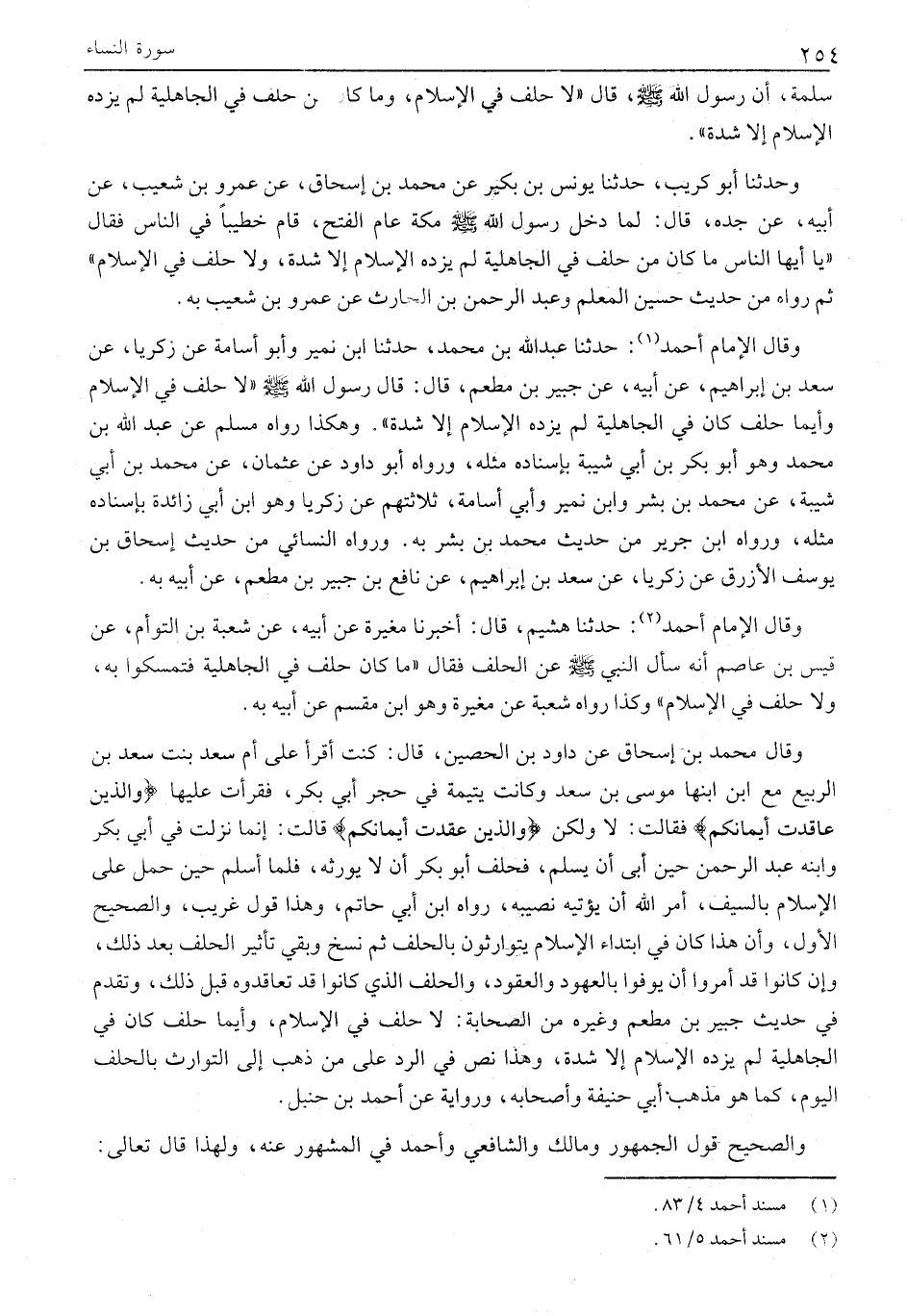وَقَالَ الْإِمَامُ أَحْمَدُ «1» : حَدَّثَنَا عَبْدُ اللَّهِ بْنُ مُحَمَّدٍ، حَدَّثَنَا ابْنُ نُمَيْرٍ وَأَبُو أُسَامَةَ عَنْ زَكَرِيَّا، عَنْ سَعْدِ بْنِ إِبْرَاهِيمَ، عَنْ أَبِيهِ، عَنْ جُبَيْرِ بْنِ مُطْعِمٍ، قَالَ: قَالَ رَسُولُ اللَّهِ صَلَّى اللَّهُ عَلَيْهِ وَسَلَّمَ «لَا حِلْفَ فِي الْإِسْلَامِ وَأَيُّمَا حِلْفٍ كَانَ فِي الْجَاهِلِيَّةِ لَمْ يزده الْإِسْلَامُ إِلَّا شِدَّةً» . وَهَكَذَا رَوَاهُ مُسْلِمٌ عَنْ عبد الله بن محمد وهو أبو بكر بْنُ أَبِي شَيْبَةَ بِإِسْنَادِهِ مِثْلَهُ، وَرَوَاهُ أَبُو دَاوُدَ عَنْ عُثْمَانَ، عَنْ مُحَمَّدِ بْنِ أَبِي شَيْبَةَ، عَنْ مُحَمَّدِ بْنِ بِشْرٍ وَابْنِ نُمَيْرِ وَأَبِي أُسَامَةَ، ثَلَاثَتُهُمْ عَنْ زَكَرِيَّا وَهُوَ ابْنُ أَبِي زَائِدَةَ بِإِسْنَادِهِ مِثْلَهُ، وَرَوَاهُ ابْنُ جَرِيرٍ مِنْ حَدِيثِ مُحَمَّدِ بْنِ بِشْرٍ بِهِ. وَرَوَاهُ النَّسَائِيُّ مِنْ حَدِيثِ إِسْحَاقَ بْنِ يُوسُفَ الْأَزْرَقِ عَنْ زَكَرِيَّا، عَنْ سَعْدِ بْنِ إِبْرَاهِيمَ، عَنْ نَافِعِ بْنِ جُبَيْرِ بْنِ مُطْعِمٍ، عَنْ أَبِيهِ بِهِ.