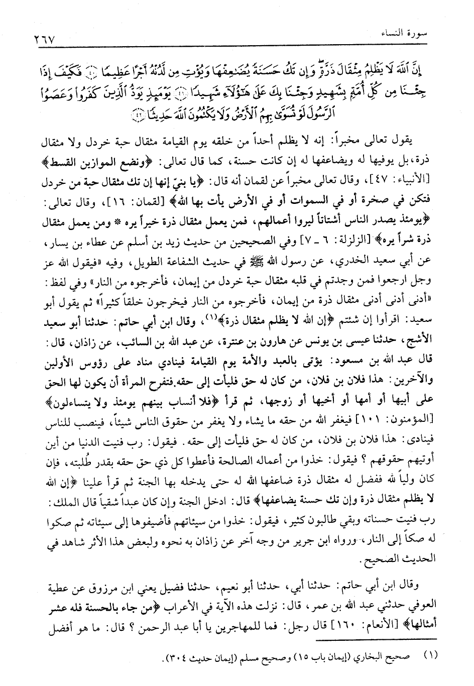 يَوْمَئِذٍ يَصْدُرُ النَّاسُ أَشْتاتاً لِيُرَوْا أَعْمالَهُمْ، فَمَنْ يَعْمَلْ مِثْقالَ ذَرَّةٍ خَيْراً يَرَهُ وَمَنْ يَعْمَلْ مِثْقالَ ذَرَّةٍ شَرًّا يَرَهُ [الزلزلة: 6- 7] وَفِي الصَّحِيحَيْنِ مِنْ حَدِيثِ زَيْدِ بْنِ أَسْلَمَ عَنْ عَطَاءِ بْنِ يَسَارٍ، عَنْ أَبِي سَعِيدٍ الْخُدْرِيِّ، عَنْ رَسُولِ اللَّهِ صَلَّى اللَّهُ عَلَيْهِ وَسَلَّمَ فِي حَدِيثِ الشَّفَاعَةِ الطَّوِيلِ، وَفِيهِ «فَيَقُولُ اللَّهُ عَزَّ وَجَلَّ ارْجِعُوا فَمَنْ وَجَدْتُمْ فِي قَلْبِهِ مِثْقَالَ حَبَّةِ خَرْدَلٍ مِنْ إِيمَانٍ، فَأَخْرِجُوهُ مِنَ النَّارِ» وَفِي لَفْظٍ: