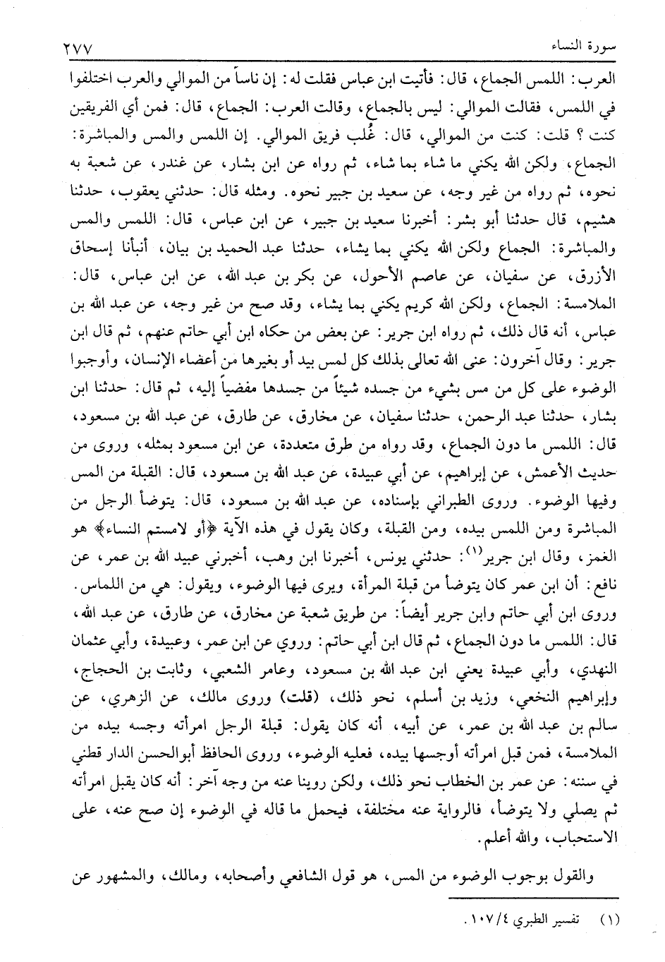 الْعَرَبِ: اللَّمْسُ الْجِمَاعُ، قَالَ: فَأَتَيْتُ ابْنَ عَبَّاسٍ فَقُلْتُ لَهُ: إِنْ نَاسًا مِنَ الْمَوَالِي وَالْعَرَبِ اخْتَلَفُوا فِي اللَّمْسِ، فَقَالَتِ الْمَوَالِي: لَيْسَ بِالْجِمَاعِ، وقالت العرب: الجماع، قال: فمن أَيِّ الْفَرِيقَيْنِ كُنْتَ؟ قُلْتُ: كُنْتُ مِنَ الْمَوَالِي، قَالَ: غُلِبَ فَرِيقُ الْمُوَالِي. إِنَّ اللَّمْسَ وَالْمَسَّ وَالْمُبَاشَرَةَ: