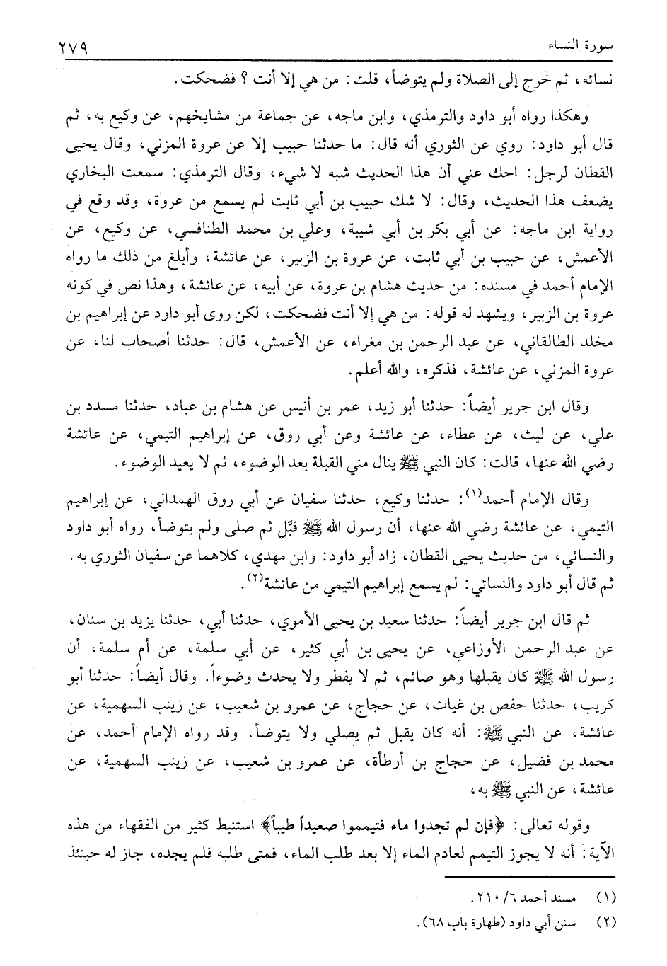 ثم قال ابْنُ جَرِيرٍ أَيْضًا: حَدَّثَنَا سَعِيدُ بْنُ يَحْيَى الْأُمَوِيُّ، حَدَّثَنَا أَبِي، حَدَّثَنَا يَزِيدُ بْنُ سِنَانٍ، عَنْ عَبْدِ الرَّحْمَنِ الْأَوْزَاعِيِّ، عَنْ يَحْيَى بْنِ أَبِي كَثِيرٍ، عَنْ أَبِي سَلَمَةَ، عَنْ أُمِّ سَلَمَةَ، أَنَّ رَسُولَ اللَّهِ صَلَّى اللَّهُ عَلَيْهِ وَسَلَّمَ كَانَ يُقَبِّلُهَا وَهُوَ صَائِمٌ، ثُمَّ لَا يُفْطِرُ وَلَا يُحْدِثُ وُضُوءًا. وَقَالَ أَيْضًا: حَدَّثَنَا أَبُو كَرَيْبٍ، حَدَّثَنَا حَفْصُ بْنُ غِيَاثٍ، عَنْ حَجَّاجٍ، عَنِ عَمْرِو بْنِ شُعَيْبٍ، عَنْ زَيْنَبَ السَّهْمِيَّةِ، عَنْ عَائِشَةَ، عَنِ النَّبِيِّ صَلَّى اللَّهُ عَلَيْهِ وَسَلَّمَ: أَنَّهُ كَانَ يُقَبِّلُ ثُمَّ يُصَلِّي وَلَا يَتَوَضَّأُ. وَقَدْ رَوَاهُ الْإِمَامُ أَحْمَدُ، عَنْ مُحَمَّدِ بْنِ فُضَيْلٍ، عَنْ حَجَّاجِ بْنِ أَرْطَاةَ، عَنْ عَمْرِو بْنِ شُعَيْبٍ، عَنْ زَيْنَبَ السَّهْمِيَّةِ، عَنْ عَائِشَةَ، عَنِ النَّبِيِّ صَلَّى اللَّهُ عَلَيْهِ وسلّم به، وقوله تعالى: فَلَمْ تَجِدُوا مَاءً فَتَيَمَّمُوا صَعِيداً طَيِّباً اسْتَنْبَطَ كَثِيرٌ مِنَ الْفُقَهَاءِ مِنْ هَذِهِ الْآيَةِ: أَنَّهُ لَا يجوز التيمم لعادم الماء إلا بعد طلب الماء، فَمَتَى طَلَبَهُ فَلَمْ يَجِدْهُ، جَازَ لَهُ حِينَئِذٍ