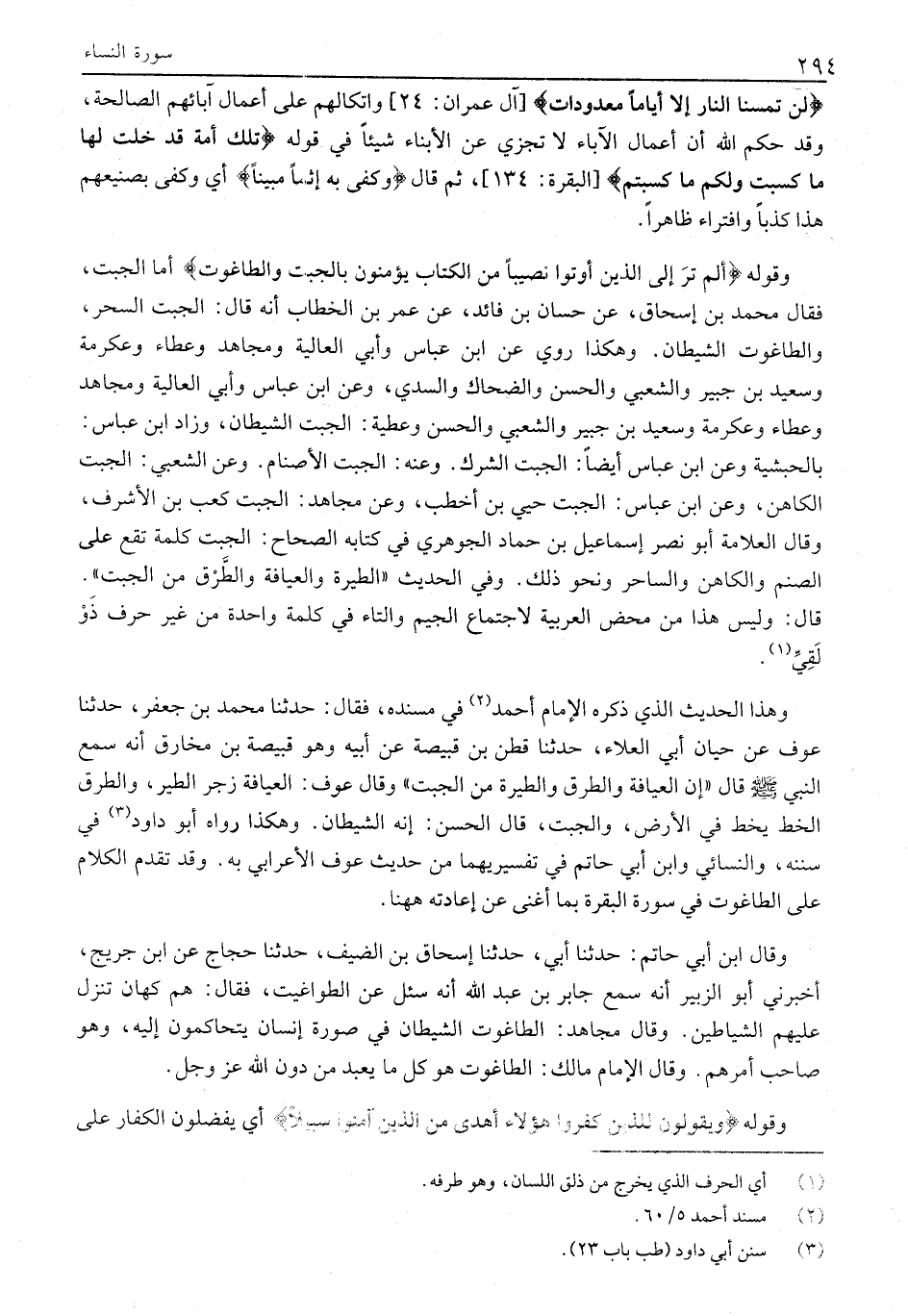 بِالْحَبَشِيَّةِ وَعَنِ ابْنِ عَبَّاسٍ أَيْضًا: الْجِبْتُ الشِّرْكُ. وَعَنْهُ: الْجِبْتُ الْأَصْنَامُ. وَعَنِ الشَّعْبِيِّ: الْجِبْتُ الْكَاهِنُ، وَعَنِ ابْنِ عَبَّاسٍ: الْجِبْتُ حُيَيُّ بْنُ أَخْطَبَ، وَعَنْ مُجَاهِدٍ: الْجِبْتُ كَعْبُ بْنُ الأشرف، وقال العلامة أَبُو نَصْرٍ إِسْمَاعِيلَ بْنِ حَمَّادٍ الْجَوْهَرِيُّ فِي كِتَابِهِ الصِّحَاحِ: الْجِبْتُ كَلِمَةٌ تَقَعُ عَلَى الصَّنَمِ وَالْكَاهِنِ وَالسَّاحِرِ وَنَحْوِ ذَلِكَ. وَفِي الْحَدِيثِ «الطِّيَرَةُ وَالْعِيَافَةُ وَالطَّرْقُ من الجبت» .