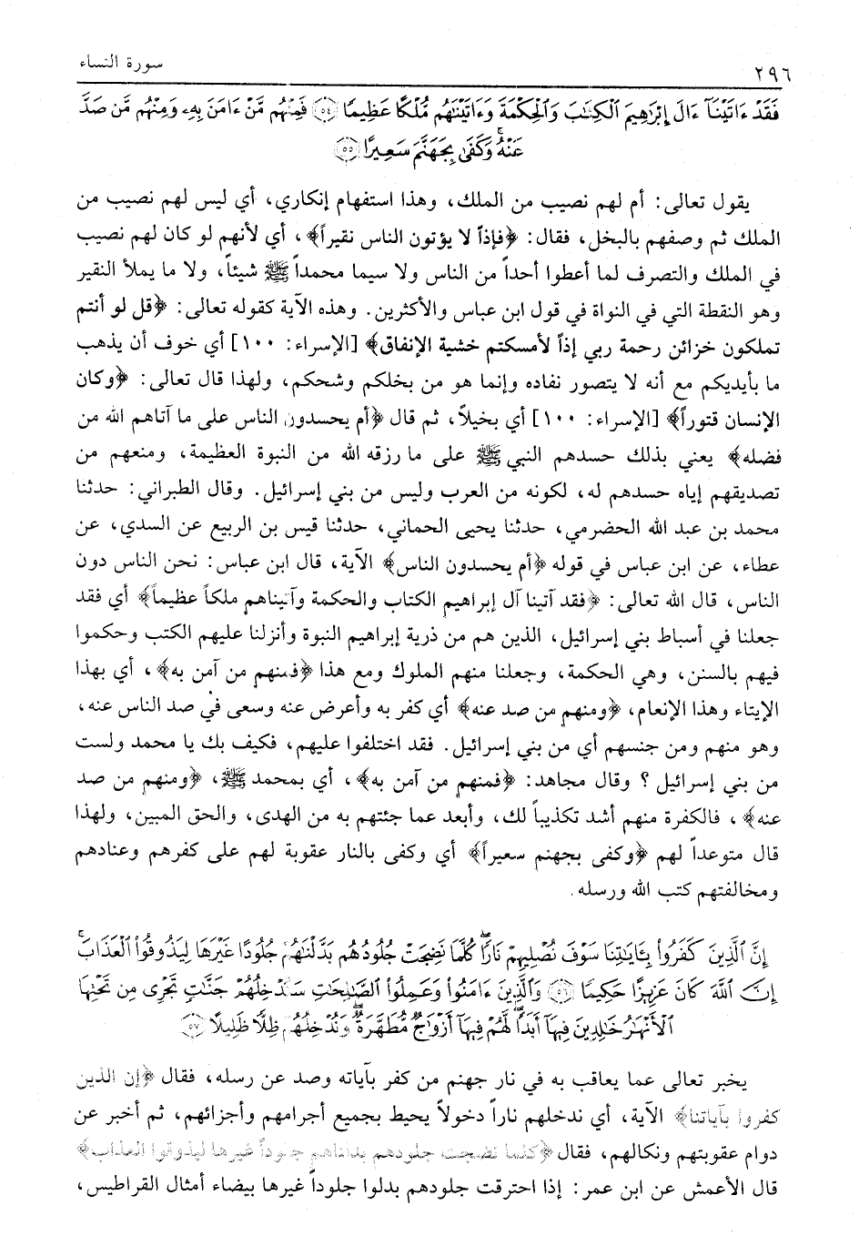 أَمْ لَهُمْ نَصِيبٌ مِنَ الْمُلْكِ فَإِذاً لَا يُؤْتُونَ النَّاسَ نَقِيراً (53) أَمْ يَحْسُدُونَ النَّاسَ عَلى مَا آتاهُمُ اللَّهُ مِنْ فَضْلِهِ فَقَدْ آتَيْنا آلَ إِبْراهِيمَ الْكِتابَ وَالْحِكْمَةَ وَآتَيْناهُمْ مُلْكاً عَظِيماً (54) فَمِنْهُمْ مَنْ آمَنَ بِهِ وَمِنْهُمْ مَنْ صَدَّ عَنْهُ وَكَفى بِجَهَنَّمَ سَعِيراً (55)