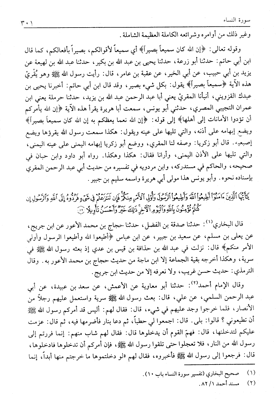 قَالَ الْبُخَارِيُّ «1» : حَدَّثَنَا صَدَقَةُ بْنُ الْفَضْلِ، حَدَّثَنَا حَجَّاجِ بْنِ مُحَمَّدٍ الْأَعْوَرِ عَنِ ابْنِ جُرَيْجٍ، عَنْ يَعْلَى بْنِ مُسْلِمٍ، عَنْ سَعِيدِ بْنِ جُبَيْرٍ، عَنِ ابْنِ عَبَّاسٍ أَطِيعُوا اللَّهَ وَأَطِيعُوا الرَّسُولَ وَأُولِي الْأَمْرِ مِنْكُمْ قَالَ: نَزَلَتْ فِي عَبْدِ اللَّهِ بْنِ حُذَافَةَ بْنِ قَيْسِ بْنِ عَدِيٍّ إِذْ بَعَثَهُ رَسُولُ اللَّهِ صَلَّى اللَّهُ عَلَيْهِ وَسَلَّمَ فِي سَرِيَّةٍ، وَهَكَذَا أَخْرَجَهُ بَقِيَّةُ الْجَمَاعَةِ إِلَّا ابْنَ مَاجَهْ مِنْ حَدِيثِ حَجَّاجِ بْنِ مُحَمَّدٍ الْأَعْوَرِ بِهِ. وَقَالَ التِّرْمِذِيُّ: حَدِيثٌ حَسَنٌ غَرِيبٌ، وَلَا نَعْرِفُهُ إِلَّا مِنْ حديث ابن جريج.