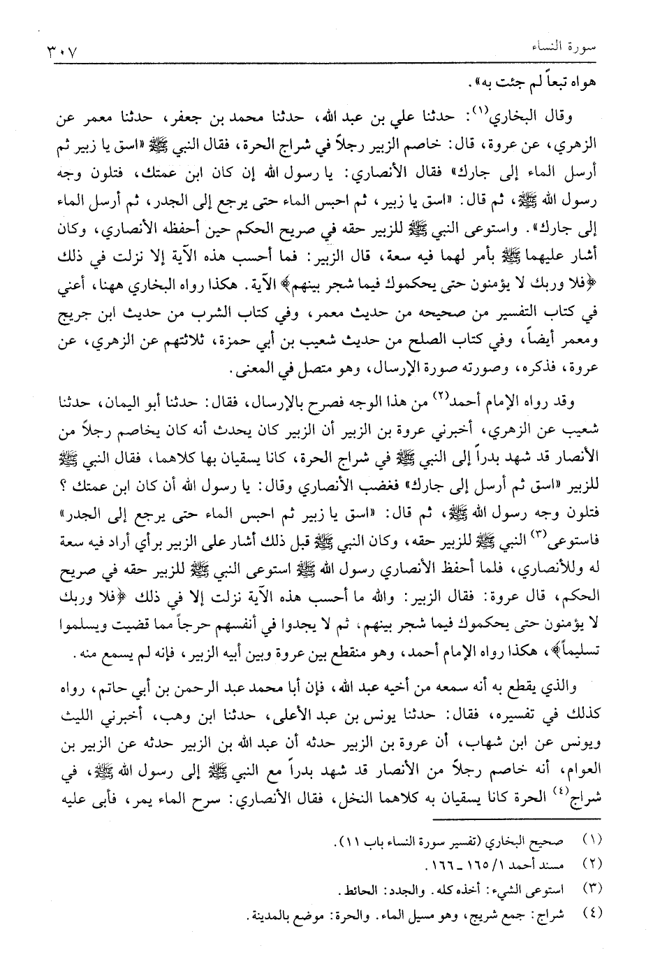 فَتَلَوَّنَ وَجْهُ رَسُولِ اللَّهِ صَلَّى اللَّهُ عَلَيْهِ وَسَلَّمَ، ثُمَّ قَالَ: «اسْقِ يَا زُبَيْرُ ثُمَّ احْبِسِ الْمَاءَ حَتَّى يَرْجِعَ إِلَى الْجَدْرِ» فَاسْتَوْعَى «3» النَّبِيُّ صَلَّى اللَّهُ عَلَيْهِ وَسَلَّمَ لِلزُّبَيْرِ حَقَّهُ، وَكَانَ النَّبِيُّ صَلَّى اللَّهُ عَلَيْهِ وَسَلَّمَ قَبْلَ ذَلِكَ أَشَارَ عَلَى الزُّبَيْرِ بِرَأْيٍ أَرَادَ فِيهِ سَعَةً لَهُ وَلِلْأَنْصَارِيِّ، فَلَمَّا أَحْفَظَ الْأَنْصَارِيُّ رَسُولَ اللَّهِ صَلَّى اللَّهُ عَلَيْهِ وَسَلَّمَ اسْتَوْعَى النَّبِيُّ صَلَّى اللَّهُ عَلَيْهِ وَسَلَّمَ لِلزُّبَيْرِ حَقَّهُ فِي صَرِيحِ الْحُكْمِ، قَالَ عُرْوَةُ: فَقَالَ الزُّبَيْرُ: وَاللَّهِ مَا أَحْسَبُ هَذِهِ الْآيَةَ نَزَلَتْ إِلَّا فِي ذَلِكَ فَلا وَرَبِّكَ لَا يُؤْمِنُونَ حَتَّى يُحَكِّمُوكَ فِيما شَجَرَ بَيْنَهُمْ، ثُمَّ لَا يَجِدُوا فِي أَنْفُسِهِمْ حَرَجاً مِمَّا قَضَيْتَ وَيُسَلِّمُوا تَسْلِيماً، هَكَذَا رَوَاهُ الْإِمَامُ أَحْمَدُ، وَهُوَ مُنْقَطِعٌ بَيْنَ عُرْوَةَ وَبَيْنَ أَبِيهِ الزُّبَيْرِ، فَإِنَّهُ لَمْ يَسْمَعْ مِنْهُ.