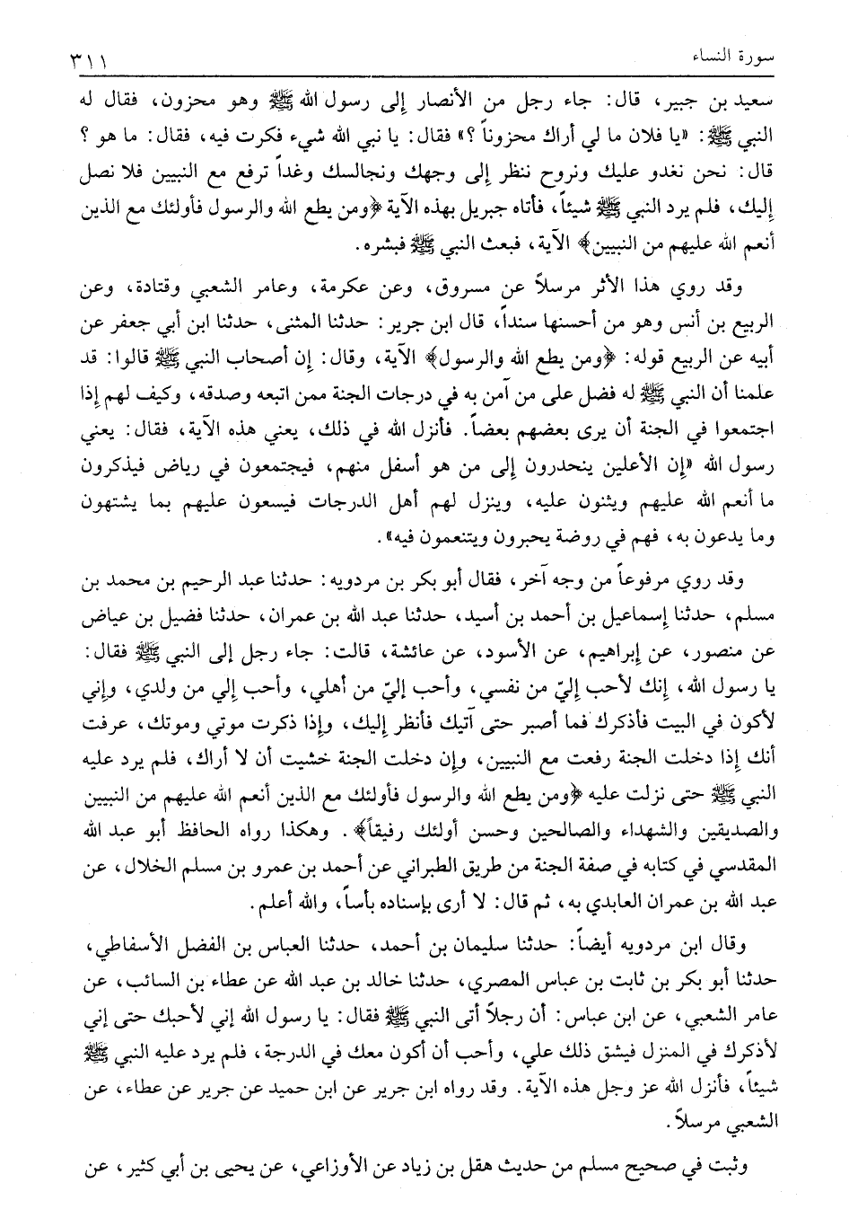 يَا رَسُولَ اللَّهِ، إِنَّكَ لَأَحَبُّ إِلَيَّ مِنْ نَفْسِي، وَأَحَبُّ إِلَيَّ مِنْ أَهْلِي، وَأَحَبُّ إِلَيَّ مِنْ وَلَدِي، وَإِنِّي لَأَكُونُ فِي الْبَيْتِ فَأَذْكُرُكَ فَمَا أَصْبِرُ حَتَّى آتِيَكَ فَأَنْظُرَ إِلَيْكَ، وَإِذَا ذَكَرْتُ مَوْتِي وَمَوْتَكَ، عَرَفْتُ أَنَّكَ إِذَا دَخَلْتَ الْجَنَّةَ رُفِعْتَ مع النبيين، وإن دخلت الجنة خشيت أن لا أَرَاكَ، فَلَمْ يَرُدَّ عَلَيْهِ النَّبِيُّ صَلَّى اللَّهُ عَلَيْهِ وَسَلَّمَ حَتَّى نَزَلَتْ عَلَيْهِ وَمَنْ يُطِعِ اللَّهَ وَالرَّسُولَ فَأُولئِكَ مَعَ الَّذِينَ أَنْعَمَ اللَّهُ عَلَيْهِمْ مِنَ النَّبِيِّينَ وَالصِّدِّيقِينَ وَالشُّهَداءِ وَالصَّالِحِينَ وَحَسُنَ أُولئِكَ رَفِيقاً. وَهَكَذَا رَوَاهُ الْحَافِظُ أَبُو عَبْدِ اللَّهِ الْمَقْدِسِيُّ فِي كِتَابِهِ في صِفَةُ الْجَنَّةِ مِنْ طَرِيقِ الطَّبَرَانِيِّ عَنْ أَحْمَدَ بْنِ عَمْرِو بْنِ مُسْلِمٍ الْخَلَّالِ، عَنْ عَبْدِ اللَّهِ بْنِ عِمْرَانَ الْعَابِدِيِّ بِهِ، ثُمَّ قَالَ: لَا أَرَى بِإِسْنَادِهِ بَأْسًا، وَاللَّهُ أَعْلَمُ.