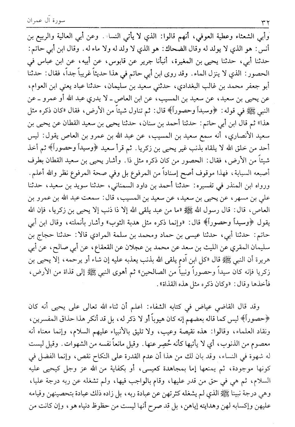 وَقَدْ قَالَ الْقَاضِي عِيَاضٌ فِي كِتَابِهِ الشِّفَاءِ: اعْلَمْ أَنَّ ثَنَاءَ اللَّهِ تَعَالَى عَلَى يَحْيَى أَنَّهُ كَانَ حَصُوراً لَيْسَ كَمَا قَالَهُ بَعْضُهُمْ إِنَّهُ كَانَ هَيُّوبًا أَوْ لَا ذَكَرَ لَهُ، بَلْ قَدْ أَنْكَرَ هَذَا حُذَّاقُ الْمُفَسِّرِينَ، وَنُقَّادُ الْعُلَمَاءِ، وَقَالُوا: هَذِهِ نَقِيصَةٌ وَعَيْبٌ، وَلَا تَلِيقُ بِالْأَنْبِيَاءِ عَلَيْهِمُ السَّلَامُ، وَإِنَّمَا مَعْنَاهُ أَنَّهُ مَعْصُومٌ مِنَ الذُّنُوبِ، أَيْ لَا يَأْتِيهَا كَأَنَّهُ حُصِرَ عَنْهَا. وَقِيلَ مَانِعًا نَفْسَهُ مِنَ الشَّهَوَاتِ. وَقِيلَ لَيْسَتْ لَهُ شَهْوَةٌ فِي النِّسَاءِ، وَقَدْ بَانَ لَكَ مِنْ هَذَا أَنَّ عَدَمَ الْقُدْرَةِ عَلَى النِّكَاحِ نَقْصٌ، وَإِنَّمَا الْفَضْلُ فِي كَوْنِهَا مَوْجُودَةً، ثم يمنعها إِمَّا بِمُجَاهَدَةٍ كَعِيسَى، أَوْ بِكِفَايَةٍ مِنَ اللَّهِ عَزَّ وَجَلَّ كَيَحْيَى عَلَيْهِ السَّلَامُ، ثُمَّ هِيَ في حق من قدر عَلَيْهَا، وَقَامَ بِالْوَاجِبِ فِيهَا، وَلَمْ تَشْغَلْهُ عَنْ ربه درجة عليا، وهي درجة نبينا صَلَّى اللَّهُ عَلَيْهِ وَسَلَّمَ الَّذِي لَمْ يَشْغَلْهُ كَثْرَتُهُنَّ عَنْ عِبَادَةِ رَبِّهِ، بَلْ زَادَهُ ذَلِكَ عبادة بتحصينهن وقيامه عليهن وإكسابه لَهُنَّ وَهِدَايَتِهِ إِيَّاهُنَّ، بَلْ قَدْ صَرَّحَ أَنَّهَا لَيْسَتْ مِنْ حُظُوظِ دُنْيَاهُ هُوَ، وَإِنْ كَانَتْ من