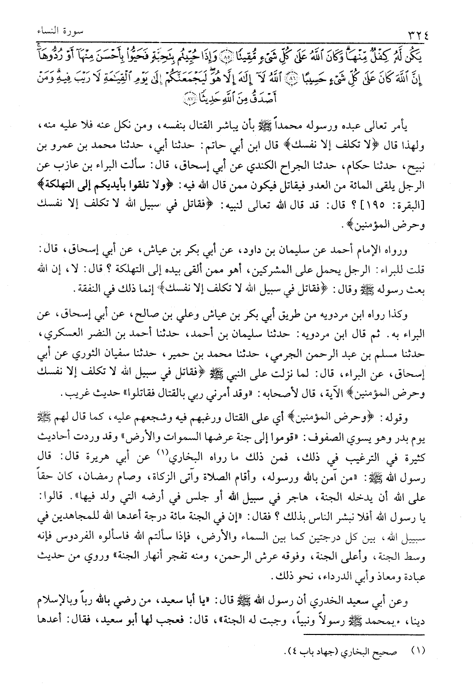 فَقاتِلْ فِي سَبِيلِ اللَّهِ لَا تُكَلَّفُ إِلاَّ نَفْسَكَ وَحَرِّضِ الْمُؤْمِنِينَ عَسَى اللَّهُ أَنْ يَكُفَّ بَأْسَ الَّذِينَ كَفَرُوا وَاللَّهُ أَشَدُّ بَأْساً وَأَشَدُّ تَنْكِيلاً (84) مَنْ يَشْفَعْ شَفاعَةً حَسَنَةً يَكُنْ لَهُ نَصِيبٌ مِنْها وَمَنْ يَشْفَعْ شَفاعَةً سَيِّئَةً يَكُنْ لَهُ كِفْلٌ مِنْها وَكانَ اللَّهُ عَلى كُلِّ شَيْءٍ مُقِيتاً (85) وَإِذا حُيِّيتُمْ بِتَحِيَّةٍ فَحَيُّوا بِأَحْسَنَ مِنْها أَوْ رُدُّوها إِنَّ اللَّهَ كانَ عَلى كُلِّ شَيْءٍ حَسِيباً (86) اللَّهُ لَا إِلهَ إِلاَّ هُوَ لَيَجْمَعَنَّكُمْ إِلى يَوْمِ الْقِيامَةِ لَا رَيْبَ فِيهِ وَمَنْ أَصْدَقُ مِنَ اللَّهِ حَدِيثاً (87)