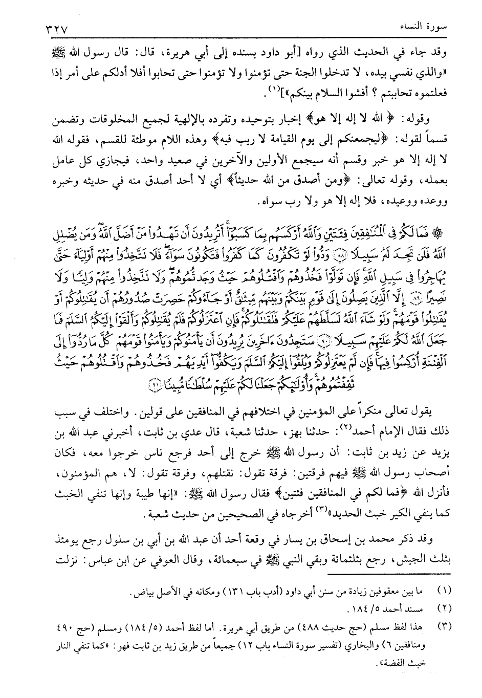 فَما لَكُمْ فِي الْمُنافِقِينَ فِئَتَيْنِ وَاللَّهُ أَرْكَسَهُمْ بِما كَسَبُوا أَتُرِيدُونَ أَنْ تَهْدُوا مَنْ أَضَلَّ اللَّهُ وَمَنْ يُضْلِلِ اللَّهُ فَلَنْ تَجِدَ لَهُ سَبِيلاً (88) وَدُّوا لَوْ تَكْفُرُونَ كَما كَفَرُوا فَتَكُونُونَ سَواءً فَلا تَتَّخِذُوا مِنْهُمْ أَوْلِياءَ حَتَّى يُهاجِرُوا فِي سَبِيلِ اللَّهِ فَإِنْ تَوَلَّوْا فَخُذُوهُمْ وَاقْتُلُوهُمْ حَيْثُ وَجَدْتُمُوهُمْ وَلا تَتَّخِذُوا مِنْهُمْ وَلِيًّا وَلا نَصِيراً (89) إِلاَّ الَّذِينَ يَصِلُونَ إِلى قَوْمٍ بَيْنَكُمْ وَبَيْنَهُمْ مِيثاقٌ أَوْ جاؤُكُمْ حَصِرَتْ صُدُورُهُمْ أَنْ يُقاتِلُوكُمْ أَوْ يُقاتِلُوا قَوْمَهُمْ وَلَوْ شاءَ اللَّهُ لَسَلَّطَهُمْ عَلَيْكُمْ فَلَقاتَلُوكُمْ فَإِنِ اعْتَزَلُوكُمْ فَلَمْ يُقاتِلُوكُمْ وَأَلْقَوْا إِلَيْكُمُ السَّلَمَ فَما جَعَلَ اللَّهُ لَكُمْ عَلَيْهِمْ سَبِيلاً (90) سَتَجِدُونَ آخَرِينَ يُرِيدُونَ أَنْ يَأْمَنُوكُمْ وَيَأْمَنُوا قَوْمَهُمْ كُلَّما رُدُّوا إِلَى الْفِتْنَةِ أُرْكِسُوا فِيها فَإِنْ لَمْ يَعْتَزِلُوكُمْ وَيُلْقُوا إِلَيْكُمُ السَّلَمَ وَيَكُفُّوا أَيْدِيَهُمْ فَخُذُوهُمْ وَاقْتُلُوهُمْ حَيْثُ ثَقِفْتُمُوهُمْ وَأُولئِكُمْ جَعَلْنا لَكُمْ عَلَيْهِمْ سُلْطاناً مُبِيناً (91)