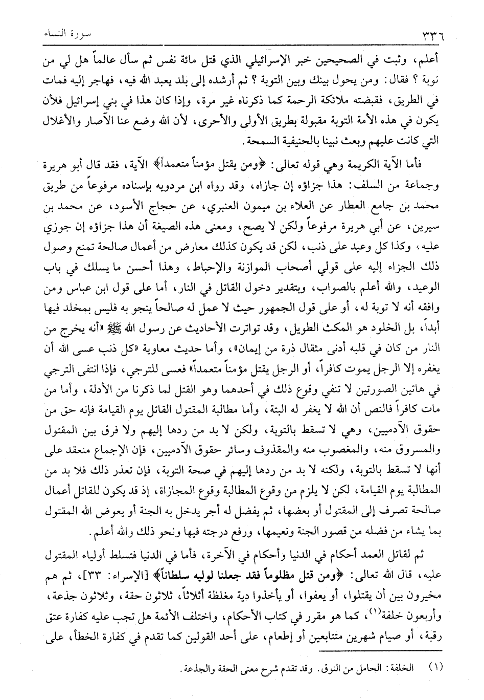 فَأَمَّا الْآيَةُ الْكَرِيمَةُ وَهِيَ قَوْلُهُ تَعَالَى: وَمَنْ يَقْتُلْ مُؤْمِناً مُتَعَمِّداً الآية، فَقَدْ قَالَ أَبُو هُرَيْرَةَ وَجَمَاعَةٌ مِنَ السَّلَفِ: هَذَا جَزَاؤُهُ إِنْ جَازَاهُ، وَقَدْ رَوَاهُ ابْنُ مردويه بإسناده مَرْفُوعًا مِنْ طَرِيقِ مُحَمَّدِ بْنِ جَامِعٍ الْعَطَّارِ عَنِ الْعَلَاءِ بْنِ مَيْمُونٍ الْعَنْبَرِيِّ، عَنْ حَجَّاجٍ الْأَسْوَدِ، عَنْ مُحَمَّدِ بْنِ سِيرِينَ، عَنْ أَبِي هُرَيْرَةَ مَرْفُوعًا وَلَكِنْ لَا يَصِحُّ، وَمَعْنَى هَذِهِ الصِّيغَةِ أَنَّ هَذَا جَزَاؤُهُ إِنْ جُوزِيَ عَلَيْهِ، وَكَذَا كُلُّ وَعِيدٍ عَلَى ذَنْبٍ، لَكِنْ قَدْ يَكُونُ كَذَلِكَ مُعَارَضٌ مِنْ أَعْمَالٍ صَالِحَةٍ تَمْنَعُ وُصُولَ ذَلِكَ الْجَزَاءِ إِلَيْهِ عَلَى قَوْلَيْ أَصْحَابِ الموازنة والإحباط، وَهَذَا أَحْسَنُ مَا يُسْلَكُ فِي بَابِ الْوَعِيدِ، والله أعلم بالصواب، وبتقدير دخول القاتل في النَّارِ، أَمَّا عَلَى قَوْلِ ابْنِ عَبَّاسٍ وَمَنْ وَافَقَهُ أَنَّهُ لَا تَوْبَةَ لَهُ، أَوْ عَلَى قَوْلِ الْجُمْهُورِ حَيْثُ لَا عَمَلَ لَهُ صَالِحًا ينجو به فليس بمخلد فِيهَا أَبَدًا، بَلِ الْخُلُودُ هُوَ الْمُكْثُ الطَّوِيلُ، وَقَدْ تَوَاتَرَتِ الْأَحَادِيثُ عَنْ رَسُولِ اللَّهِ صَلَّى اللَّهُ عَلَيْهِ وَسَلَّمَ «أَنَّهُ يَخْرُجُ مِنَ النَّارِ مَنْ كان في قلبه أدنى مثقال ذَرَّةٍ مِنْ إِيمَانٍ» ، وَأَمَّا حَدِيثُ مُعَاوِيَةَ «كُلُّ ذنب عسى الله أن يغفره إلا الرجل يموت كافرا، أو الرجل يقتل مؤمنا متعمدا» فعسى لِلتَّرَجِّي، فَإِذَا انْتَفَى التَّرَجِّي فِي هَاتَيْنِ الصُّورَتَيْنِ لا تنفي وُقُوعُ ذَلِكَ فِي أَحَدِهِمَا وَهُوَ الْقَتْلُ لِمَا ذَكَرْنَا مِنَ الْأَدِلَّةِ، وَأَمَّا مَنْ مَاتَ كَافِرًا فالنص أن الله لَا يُغْفَرُ لَهُ الْبَتَّةَ، وَأَمَّا مُطَالَبَةُ الْمَقْتُولِ الْقَاتِلَ يَوْمَ الْقِيَامَةِ فَإِنَّهُ حَقٌّ مِنْ حُقُوقِ الآدميين، وهي لا تسقط بالتوبة، ولكن لا بد من ردها إليهم وَلَا فَرْقَ بَيْنَ الْمَقْتُولِ وَالْمَسْرُوقِ مِنْهُ، وَالْمَغْصُوبِ مِنْهُ وَالْمَقْذُوفِ وَسَائِرِ حُقُوقِ الْآدَمِيِّينَ، فَإِنَّ الْإِجْمَاعَ منعقد على أنها لا تسقط بالتوبة، ولكنه لا بد من ردها إِلَيْهِمْ فِي صِحَّةِ التَّوْبَةِ، فَإِنَّ تَعَذَّرَ ذَلِكَ فلا بد من المطالبة يَوْمَ الْقِيَامَةِ، لَكِنْ لَا يَلْزَمُ مِنْ وُقُوعِ المطالبة وقوع المجازاة، إذ قد يَكُونُ لِلْقَاتِلِ أَعْمَالٌ صَالِحَةٌ تُصْرَفُ إِلَى الْمَقْتُولِ أَوْ بَعْضُهَا، ثُمَّ يَفْضُلُ لَهُ أَجْرٌ يَدْخُلُ به الجنة أو يعوض الله المقتول بما يشاء من فضله مِنْ قُصُورِ الْجَنَّةِ وَنَعِيمِهَا، وَرَفْعِ دَرَجَتِهِ فِيهَا ونحو ذلك والله أعلم.
