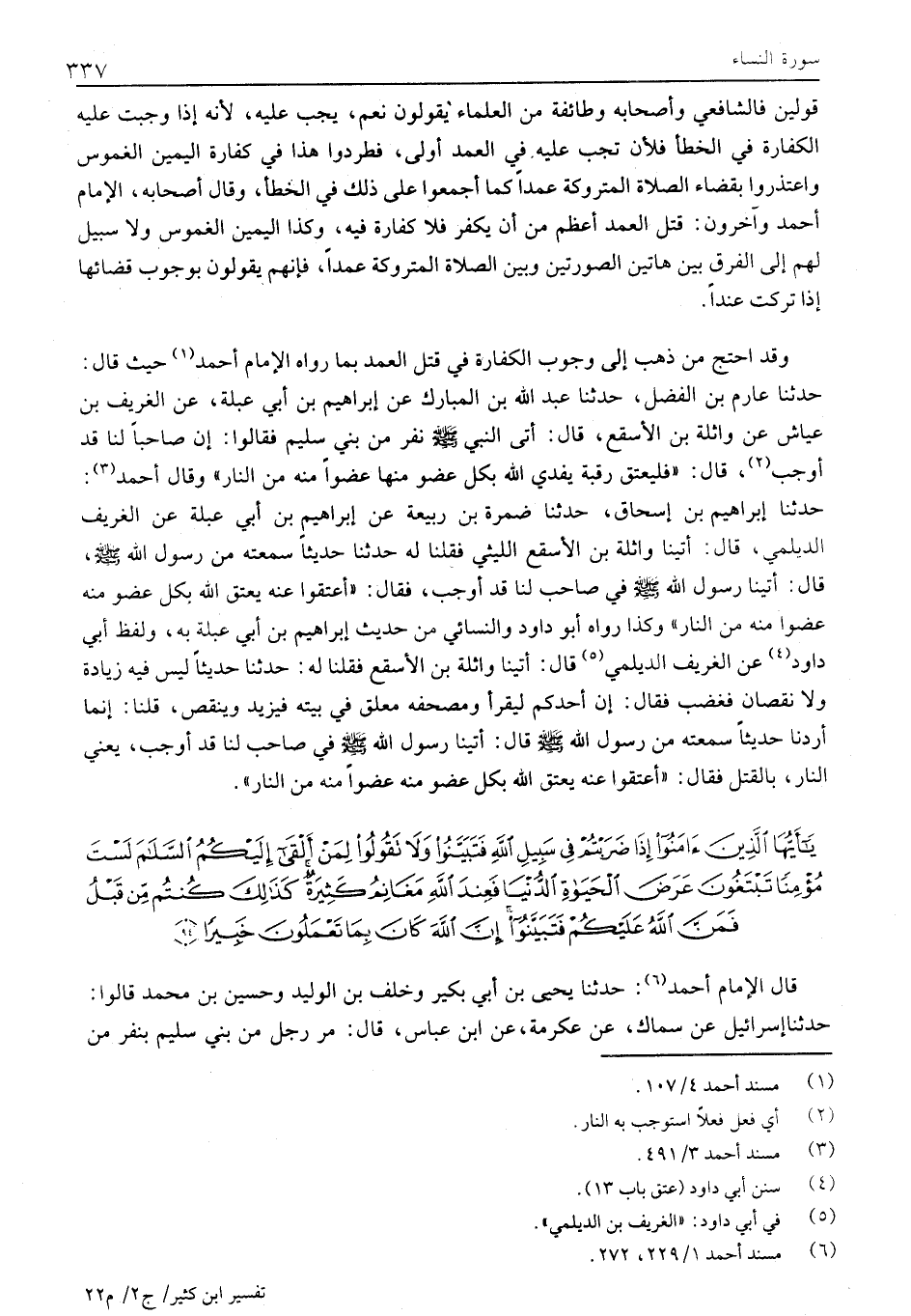 وَقَدِ احْتَجَّ مَنْ ذَهَبَ إِلَى وُجُوبِ الْكَفَّارَةِ فِي قَتْلِ الْعَمْدِ بِمَا رَوَاهُ الْإِمَامُ أَحْمَدُ «1» حَيْثُ قَالَ: