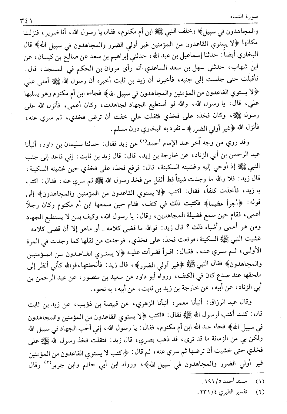 فَأَقْبَلْتُ حَتَّى جَلَسْتُ إِلَى جَنْبِهِ، فَأَخْبَرَنَا أَنَّ زَيْدَ بْنَ ثَابِتٍ أَخْبَرَهُ أَنَّ رَسُولَ اللَّهِ صَلَّى اللَّهُ عَلَيْهِ وسلم أَمْلَى عَلَيَّ لَا يَسْتَوِي الْقاعِدُونَ مِنَ الْمُؤْمِنِينَ ... وَالْمُجاهِدُونَ فِي سَبِيلِ اللَّهِ فَجَاءَهُ ابْنُ أُمِّ مَكْتُومٍ وَهُوَ يُمْلِيهَا عَلَيَّ، قَالَ: يَا رَسُولَ اللَّهِ، وَاللَّهِ لَوْ أَسْتَطِيعُ الْجِهَادَ لَجَاهَدْتُ، وَكَانَ أعمى، فَأَنْزَلَ اللَّهُ عَلَى رَسُولِهِ صَلَّى اللَّهُ عَلَيْهِ وَسَلَّمَ، وكان فخذه على فخذي فثقلت علي خفت أن ترض فخدي، ثُمَّ سُرِّيَ عَنْهُ، فَأَنْزَلَ اللَّهُ غَيْرُ أُولِي الضَّرَرِ- تفرد بِهِ الْبُخَارِيُّ دُونَ مُسْلِمٍ.
