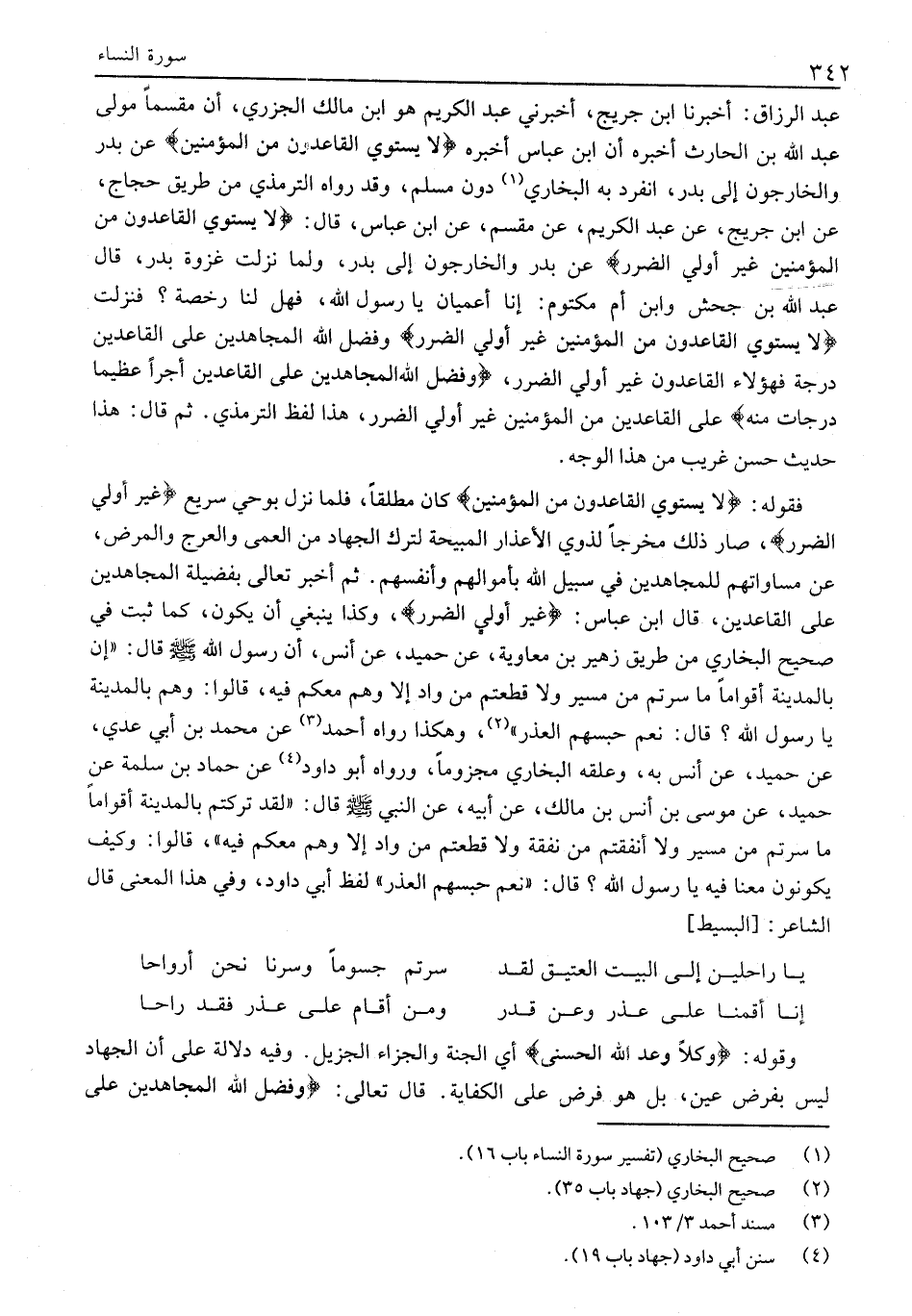 فقوله: لَا يَسْتَوِي الْقاعِدُونَ مِنَ الْمُؤْمِنِينَ كَانَ مُطْلَقًا، فَلَمَّا نَزَلَ بِوَحْيٍ سَرِيعٍ غَيْرُ أُولِي الضَّرَرِ، صَارَ ذَلِكَ مَخْرَجًا لِذَوِي الْأَعْذَارِ الْمُبِيحَةِ لِتَرْكِ الْجِهَادِ مِنِ الْعَمَى وَالْعَرَجِ وَالْمَرَضِ، عَنْ مُسَاوَاتِهِمْ لِلْمُجَاهِدِينَ فِي سَبِيلِ اللَّهِ بِأَمْوَالِهِمْ وَأَنْفُسِهِمْ. ثُمَّ أَخْبَرَ تَعَالَى بِفَضِيلَةِ الْمُجَاهِدِينَ عَلَى الْقَاعِدِينَ، قَالَ ابْنُ عَبَّاسٍ: غَيْرُ أُولِي الضَّرَرِ، وَكَذَا يَنْبَغِي أن يكون، كما ثبت في صحيح الْبُخَارِيِّ مِنْ طَرِيقِ زُهَيْرِ بْنِ مُعَاوِيَةَ، عَنْ حُمَيْدٍ، عَنْ أَنَسٍ، أَنَّ رَسُولَ اللَّهِ صَلَّى اللَّهُ عَلَيْهِ وَسَلَّمَ قَالَ: «إِنَّ بِالْمَدِينَةِ أَقْوَامًا مَا سِرْتُمْ مِنْ مَسِيرٍ وَلَا قَطَعْتُمْ مِنْ وَادٍ إِلَّا وَهُمْ مَعَكُمْ فِيهِ، قَالُوا: وَهُمْ بِالْمَدِينَةِ يَا رَسُولَ اللَّهِ؟ قَالَ: نَعَمْ حَبَسَهُمُ العذر» «2» ، وهكذا رواه أَحْمَدُ «3» عَنْ مُحَمَّدِ بْنِ أَبِي عَدِيٍّ، عَنْ حُمَيْدٍ، عَنْ أَنَسٍ بِهِ، وَعَلَّقَهُ الْبُخَارِيُّ مَجْزُومًا، وَرَوَاهُ أَبُو دَاوُدَ «4» عَنْ حَمَّادِ بْنِ سَلَمَةَ عَنْ حُمَيْدٍ، عَنْ مُوسَى بْنِ أَنَسِ بْنِ مَالِكٍ، عَنْ أَبِيهِ، عَنِ النَّبِيِّ صَلَّى اللَّهُ عَلَيْهِ وَسَلَّمَ قَالَ: «لَقَدْ تَرَكْتُمْ بِالْمَدِينَةِ أَقْوَامًا ما سرتم من مسير وَلَا أَنْفَقْتُمْ مِنْ نَفَقَةٍ وَلَا قَطَعْتُمْ مِنْ واد إلا وهم معكم فيه» ، قالوا: وكيف يكونون معنا فيه يَا رَسُولَ اللَّهِ؟ قَالَ: «نَعَمْ حَبَسَهُمُ الْعُذْرُ» لَفْظُ أَبِي دَاوُدَ، وَفِي هَذَا الْمَعْنَى قَالَ الشاعر: [البسيط]
