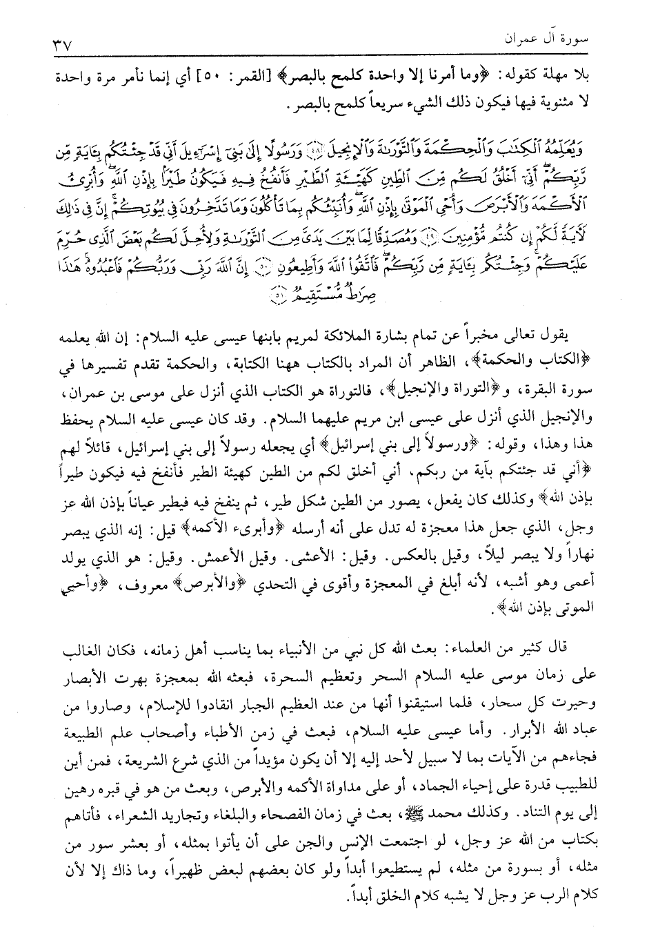 وَيُعَلِّمُهُ الْكِتابَ وَالْحِكْمَةَ وَالتَّوْراةَ وَالْإِنْجِيلَ (48) وَرَسُولاً إِلى بَنِي إِسْرائِيلَ أَنِّي قَدْ جِئْتُكُمْ بِآيَةٍ مِنْ رَبِّكُمْ أَنِّي أَخْلُقُ لَكُمْ مِنَ الطِّينِ كَهَيْئَةِ الطَّيْرِ فَأَنْفُخُ فِيهِ فَيَكُونُ طَيْراً بِإِذْنِ اللَّهِ وَأُبْرِئُ الْأَكْمَهَ وَالْأَبْرَصَ وَأُحْيِ الْمَوْتى بِإِذْنِ اللَّهِ وَأُنَبِّئُكُمْ بِما تَأْكُلُونَ وَما تَدَّخِرُونَ فِي بُيُوتِكُمْ إِنَّ فِي ذلِكَ لَآيَةً لَكُمْ إِنْ كُنْتُمْ مُؤْمِنِينَ (49) وَمُصَدِّقاً لِما بَيْنَ يَدَيَّ مِنَ التَّوْراةِ وَلِأُحِلَّ لَكُمْ بَعْضَ الَّذِي حُرِّمَ عَلَيْكُمْ وَجِئْتُكُمْ بِآيَةٍ مِنْ رَبِّكُمْ فَاتَّقُوا اللَّهَ وَأَطِيعُونِ (50) إِنَّ اللَّهَ رَبِّي وَرَبُّكُمْ فَاعْبُدُوهُ هَذَا صِراطٌ مُسْتَقِيمٌ (51)