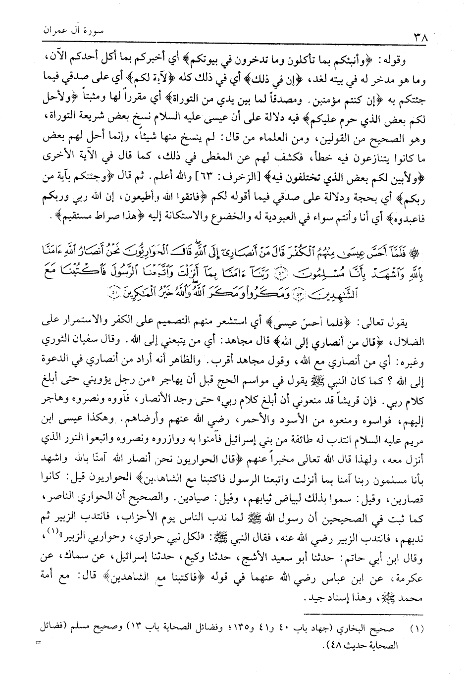 يَقُولُ تَعَالَى: فَلَمَّا أَحَسَّ عِيسى أَيِ اسْتَشْعَرَ مِنْهُمُ التَّصْمِيمَ عَلَى الْكُفْرِ وَالِاسْتِمْرَارَ عَلَى الضَّلَالِ، قالَ مَنْ أَنْصارِي إِلَى اللَّهِ قَالَ مُجَاهِدٌ: أَيْ مَنْ يَتْبَعُنِي إِلَى اللَّهِ. وَقَالَ سُفْيَانُ الثوري وغيره: أي مَنْ أَنْصَارِي مَعَ اللَّهِ، وَقَوْلُ مُجَاهِدٍ أَقْرَبُ. وَالظَّاهِرُ أَنَّهُ أَرَادَ مَنْ أَنْصَارِي فِي الدَّعْوَةِ إِلَى اللَّهِ؟ كَمَا كَانَ النَّبِيُّ صَلَّى اللَّهُ عَلَيْهِ وَسَلَّمَ يَقُولُ فِي مَوَاسِمِ الْحَجِّ قَبْلَ أن يهاجر «من رجل يؤويني حتى أُبَلِّغَ كَلَامَ رَبِّي. فَإِنَّ قُرَيْشًا قَدْ مَنَعُونِي أَنْ أُبَلِّغَ كَلَامَ رَبِّي» حَتَّى وَجَدَ الْأَنْصَارَ، فآووه ونصروه وهاجر إليهم، فواسوه ومنعوه من الأسود والأحمر، رضي الله عنهم وأرضاهم. وهكذا عيسى ابن مريم عليه السلام انْتَدَبَ لَهُ طَائِفَةٌ مِنْ بَنِي إِسْرَائِيلَ فَآمَنُوا به ووازروه وَنَصَرُوهُ وَاتَّبَعُوا النُّورَ الَّذِي أُنْزِلَ مَعَهُ، وَلِهَذَا قال الله تَعَالَى مُخْبِرًا عَنْهُمْ قالَ الْحَوارِيُّونَ نَحْنُ أَنْصارُ اللَّهِ آمَنَّا بِاللَّهِ وَاشْهَدْ بِأَنَّا مُسْلِمُونَ رَبَّنا آمَنَّا بِما أَنْزَلْتَ وَاتَّبَعْنَا الرَّسُولَ فَاكْتُبْنا مَعَ الشَّاهِدِينَ الْحَوَارِيُّونَ قِيلَ: كَانُوا قَصَّارِينَ، وَقِيلَ: سُمُّوا بِذَلِكَ لِبَيَاضِ ثِيَابِهِمْ، وَقِيلَ: صَيَّادِينَ. وَالصَّحِيحُ أَنَّ الْحَوَارِيَّ النَّاصِرُ، كَمَا ثَبَتَ فِي الصَّحِيحَيْنِ أَنَّ رَسُولَ اللَّهِ صلى الله عليه وسلم لما نَدَبَ النَّاسَ يَوْمَ الْأَحْزَابِ، فَانْتَدَبَ الزُّبَيْرُ ثُمَّ ندبهم، فانتدب الزبير رضي الله عنه، فقال النبي صلّى الله عليه وسلّم: «لكل نبي حواري، وحواريي الزُّبَيْرُ» «1» ، وَقَالَ ابْنُ أَبِي حَاتِمٍ: حَدَّثَنَا أَبُو سَعِيدٍ الْأَشَجُّ، حَدَّثَنَا وَكِيعٌ، حَدَّثَنَا إِسْرَائِيلُ، عَنْ سِمَاكٍ، عَنْ عِكْرِمَةَ، عَنِ ابْنِ عَبَّاسٍ رَضِيَ اللَّهُ عَنْهُمَا فِي قَوْلِهِ فَاكْتُبْنا مَعَ الشَّاهِدِينَ قَالَ: مَعَ أُمَّةِ مُحَمَّدٍ صَلَّى اللَّهُ عَلَيْهِ وَسَلَّمَ، وَهَذَا إسناد جيد.