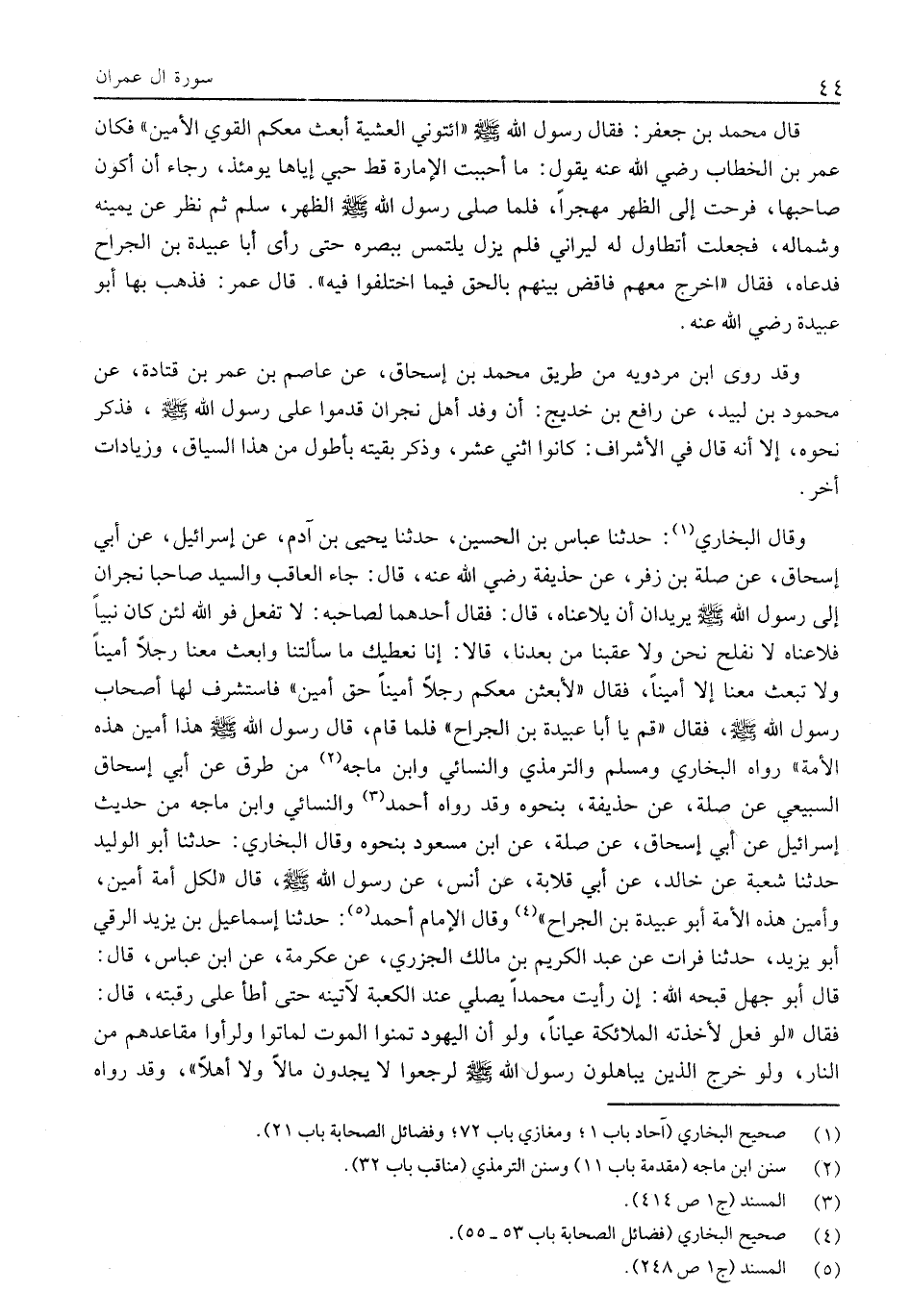 وَقَالَ الْبُخَارِيُّ «1» : حَدَّثَنَا عَبَّاسُ بْنُ الْحُسَيْنِ، حَدَّثَنَا يَحْيَى بْنُ آدَمَ، عَنْ إِسْرَائِيلَ، عَنْ أَبِي إِسْحَاقَ، عَنْ صِلَةَ بْنِ زُفَرَ، عَنْ حُذَيْفَةَ رضي الله عنه، قَالَ: جَاءَ الْعَاقِبُ وَالسَّيِّدُ صَاحِبًا نَجْرَانَ إِلَى رَسُولِ اللَّهِ صَلَّى اللَّهُ عَلَيْهِ وَسَلَّمَ يُرِيدَانِ أَنْ يُلَاعِنَاهُ، قَالَ: فَقَالَ أَحَدُهُمَا لِصَاحِبِهِ: لَا تفعل فو الله لئن كَانَ نَبِيًّا فَلَاعَنَّاهُ لَا نُفْلِحُ نَحْنُ وَلَا عَقِبُنَا مِنْ بَعْدِنَا، قَالَا: إِنَّا نُعْطِيكَ مَا سَأَلْتَنَا وَابْعَثْ مَعَنَا رَجُلًا أَمِينًا وَلَا تَبْعَثْ مَعَنَا إِلَّا أَمِينًا، فَقَالَ «لَأَبْعَثَنَّ مَعَكُمْ رَجُلًا أَمِينًا حَقَّ أَمِينٍ» فَاسْتَشْرَفَ لَهَا أَصْحَابُ رَسُولِ اللَّهِ صَلَّى اللَّهُ عَلَيْهِ وَسَلَّمَ، فَقَالَ «قُمْ يَا أَبَا عُبَيْدَةَ بْنَ الْجَرَّاحِ» فَلَمَّا قَامَ، قَالَ رَسُولُ اللَّهِ صَلَّى اللَّهُ عَلَيْهِ وَسَلَّمَ هذا أمين هذه الأمة» رواه البخاري وَمُسْلِمٌ وَالتِّرْمِذِيُّ وَالنَّسَائِيُّ وَابْنُ مَاجَهْ «2» مِنْ طُرُقٍ عَنْ أَبِي إِسْحَاقَ السَّبِيعِيِّ عَنْ صِلَةَ، عَنْ حُذَيْفَةَ، بِنَحْوِهِ وَقَدْ رَوَاهُ أَحْمَدُ «3» وَالنَّسَائِيُّ وَابْنُ مَاجَهْ مِنْ حَدِيثِ إِسْرَائِيلَ عَنْ أَبِي إِسْحَاقَ، عَنْ صِلَةَ، عَنِ ابْنِ مَسْعُودٍ بِنَحْوِهِ وَقَالَ الْبُخَارِيُّ: حَدَّثَنَا أَبُو الْوَلِيدِ حَدَّثَنَا شُعْبَةُ عَنْ خَالِدٍ، عَنْ أَبِي قِلَابَةَ، عَنْ أَنَسٍ، عَنِ رَسُولِ اللَّهِ صَلَّى اللَّهُ عَلَيْهِ وَسَلَّمَ، قال «لِكُلِّ أُمَّةٍ أَمِينٌ، وَأَمِينُ هَذِهِ الْأُمَّةِ أَبُو عُبَيْدَةَ بْنُ الْجَرَّاحِ» «4» وَقَالَ الْإِمَامُ أَحْمَدُ «5» : حَدَّثَنَا إِسْمَاعِيلُ بْنُ يَزِيدَ الرَّقِّيُّ أَبُو يَزِيدَ، حَدَّثَنَا فُرَاتٌ عَنْ عَبْدِ الْكَرِيمِ بْنِ مَالِكٍ الْجَزَرِيِّ، عَنْ عِكْرِمَةَ، عَنِ ابْنِ عَبَّاسٍ، قَالَ: