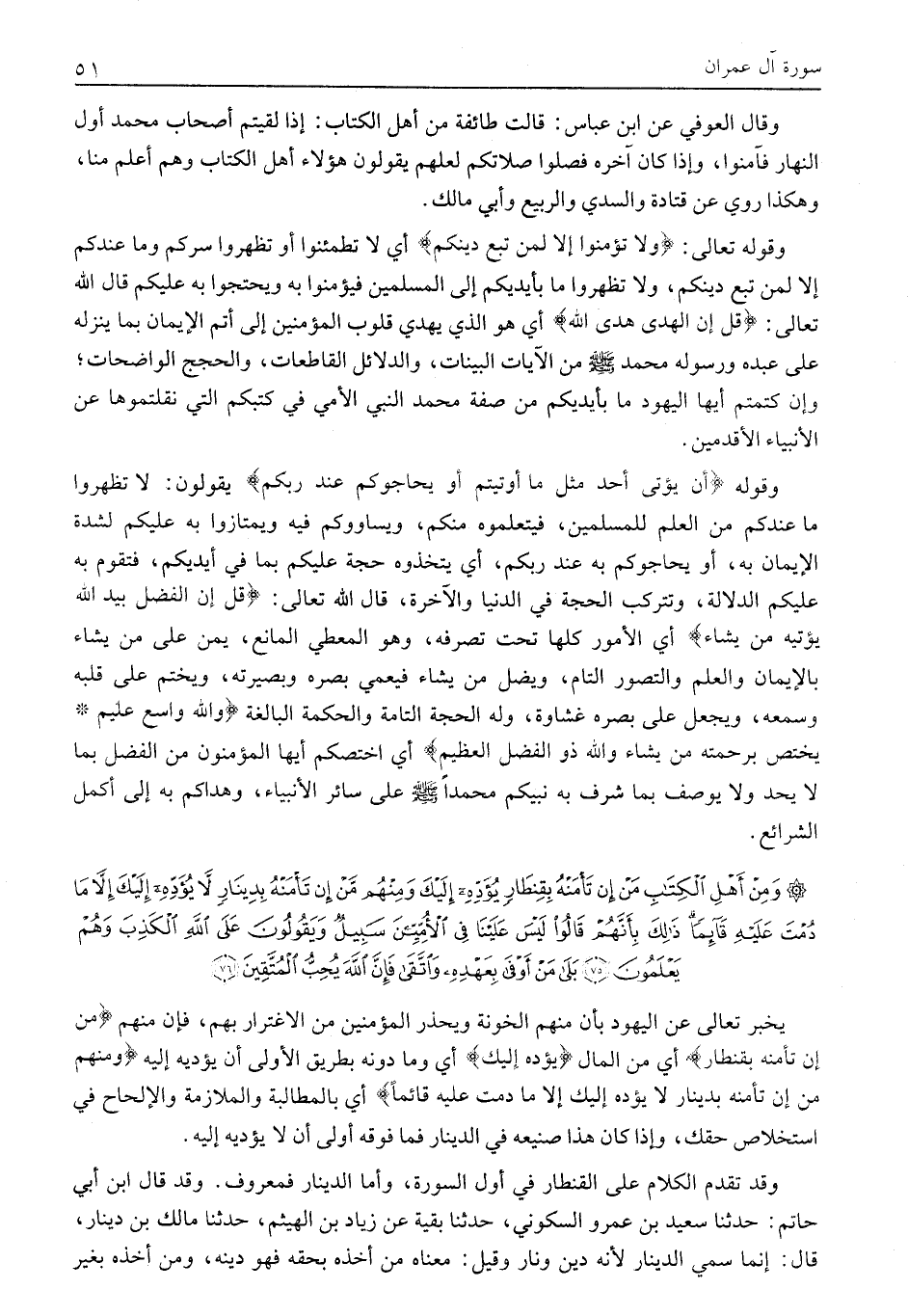 وَمِنْ أَهْلِ الْكِتابِ مَنْ إِنْ تَأْمَنْهُ بِقِنْطارٍ يُؤَدِّهِ إِلَيْكَ وَمِنْهُمْ مَنْ إِنْ تَأْمَنْهُ بِدِينارٍ لَا يُؤَدِّهِ إِلَيْكَ إِلاَّ مَا دُمْتَ عَلَيْهِ قائِماً ذلِكَ بِأَنَّهُمْ قالُوا لَيْسَ عَلَيْنا فِي الْأُمِّيِّينَ سَبِيلٌ وَيَقُولُونَ عَلَى اللَّهِ الْكَذِبَ وَهُمْ يَعْلَمُونَ (75) بَلى مَنْ أَوْفى بِعَهْدِهِ وَاتَّقى فَإِنَّ اللَّهَ يُحِبُّ الْمُتَّقِينَ (76)