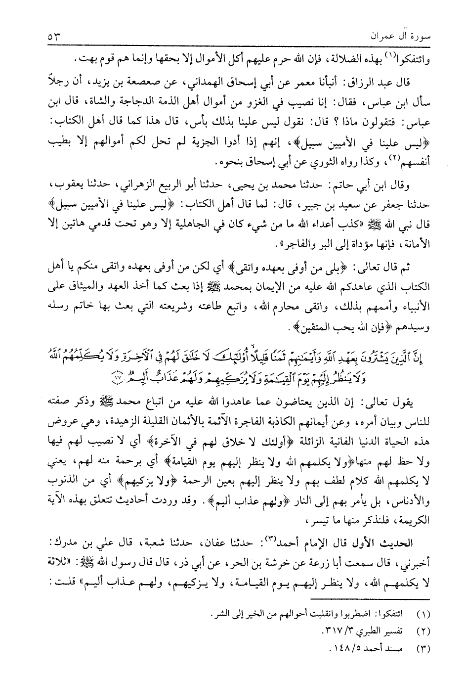 يَقُولُ تعالى: إن الذين يعتاضون عما عاهدوا اللَّهُ عَلَيْهِ مِنَ اتِّبَاعِ مُحَمَّدٍ صَلَّى اللَّهُ عليه وسلّم وذكر صفته للناس وَبَيَانِ أَمْرِهِ، وَعَنْ أَيْمَانِهِمُ الْكَاذِبَةِ الْفَاجِرَةِ الْآثِمَةِ بالأثمان القليلة الزهيدة، وهي عروض هذه الحياة الدُّنْيَا الْفَانِيَةِ الزَّائِلَةِ أُولئِكَ لَا خَلاقَ لَهُمْ فِي الْآخِرَةِ أَيْ لَا نَصِيبَ لَهُمْ فِيهَا وَلَا حَظَّ لَهُمْ مِنْهَا وَلا يُكَلِّمُهُمُ اللَّهُ وَلا يَنْظُرُ إِلَيْهِمْ يَوْمَ الْقِيامَةِ أَيْ بِرَحْمَةٍ منه لهم، يعني لا يكلمهم الله كَلَامَ لُطْفٍ بِهِمْ وَلَا يَنْظُرُ إِلَيْهِمْ بِعَيْنِ الرَّحْمَةِ وَلا يُزَكِّيهِمْ أَيْ مِنَ الذُّنُوبِ وَالْأَدْنَاسِ، بَلْ يَأْمُرُ بِهِمْ إِلَى النَّارِ وَلَهُمْ عَذابٌ أَلِيمٌ. وَقَدْ وَرَدَتْ أَحَادِيثُ تَتَعَلَّقُ بِهَذِهِ الْآيَةِ الْكَرِيمَةِ، فَلْنَذْكُرْ مِنْهَا مَا تَيَسَّرَ، الْحَدِيثُ الْأَوَّلُ قَالَ الْإِمَامُ أَحْمَدُ «3» : حَدَّثَنَا عَفَّانُ، حَدَّثَنَا شُعْبَةُ، قَالَ عَلِيُّ بْنُ مُدْرِكٍ: