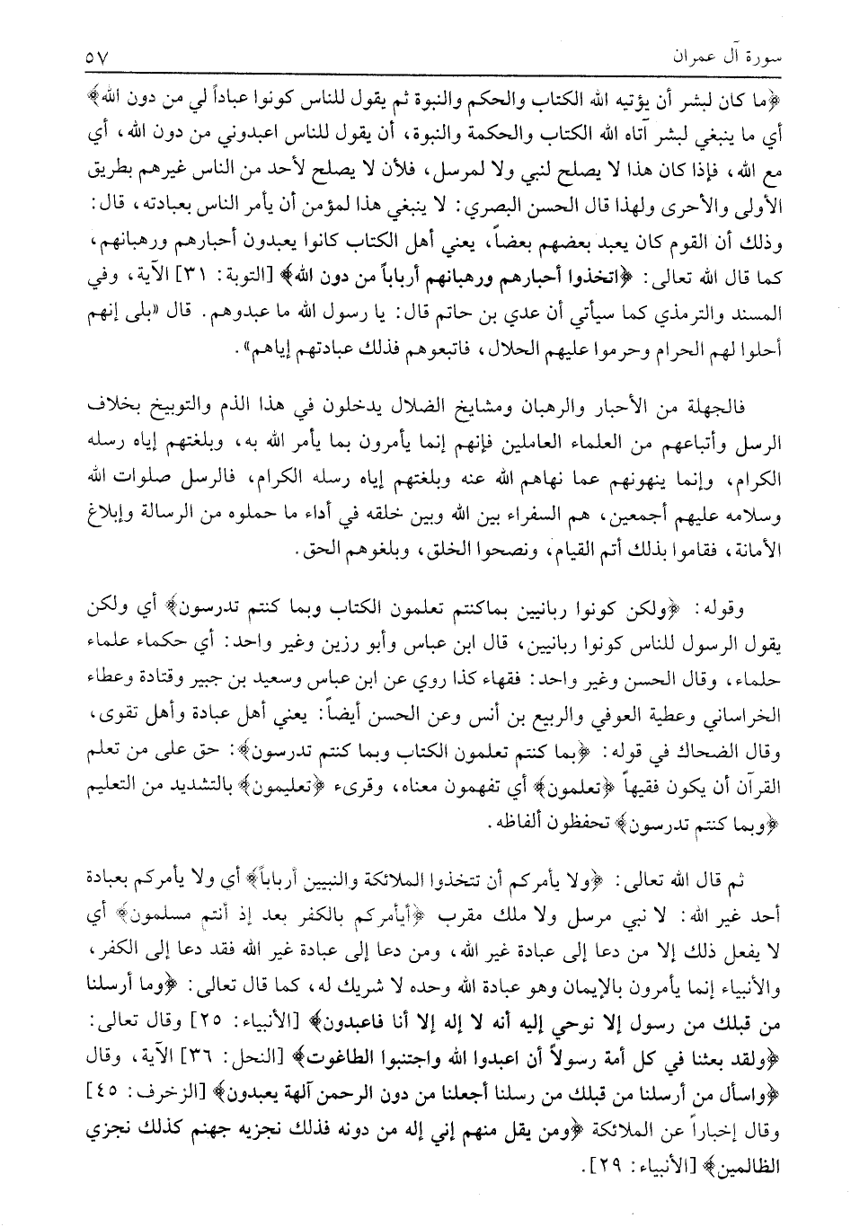 وَقَوْلُهُ: وَلكِنْ كُونُوا رَبَّانِيِّينَ بِما كُنْتُمْ تُعَلِّمُونَ الْكِتابَ وَبِما كُنْتُمْ تَدْرُسُونَ أَيْ وَلَكِنْ يَقُولُ الرَّسُولُ لِلنَّاسِ كُونُوا رَبَّانِيِّينَ، قَالَ ابْنُ عَبَّاسٍ وَأَبُو رَزِينٍ وَغَيْرُ وَاحِدٍ: أَيْ حُكَمَاءَ عُلَمَاءَ حُلَمَاءَ، وَقَالَ الْحَسَنُ وغير واحد: فقهاء كذا رُوِيَ عَنِ ابْنِ عَبَّاسٍ وَسَعِيدِ بْنِ جُبَيْرٍ وَقَتَادَةَ وَعَطَاءٍ الْخُرَاسَانِيِّ وَعَطِيَّةَ الْعَوْفِيِّ وَالرَّبِيعِ بْنِ أَنَسٍ وَعَنِ الْحَسَنِ أَيْضًا: يَعْنِي أَهْلَ عِبَادَةٍ وَأَهْلَ تَقْوَى، وَقَالَ الضَّحَّاكُ فِي قَوْلِهِ: بِما كُنْتُمْ تُعَلِّمُونَ الْكِتابَ وَبِما كُنْتُمْ تَدْرُسُونَ: حَقٌّ عَلَى مَنْ تَعَلَّمَ الْقُرْآنَ أَنْ يَكُونَ فَقِيهًا تُعَلِّمُونَ أَيْ تُفَهِّمُونَ مَعْنَاهُ، وَقُرِئَ تُعَلِّمُونَ بِالتَّشْدِيدِ مِنَ التَّعْلِيمِ وَبِما كُنْتُمْ تَدْرُسُونَ تَحْفَظُونَ أَلْفَاظَهُ.