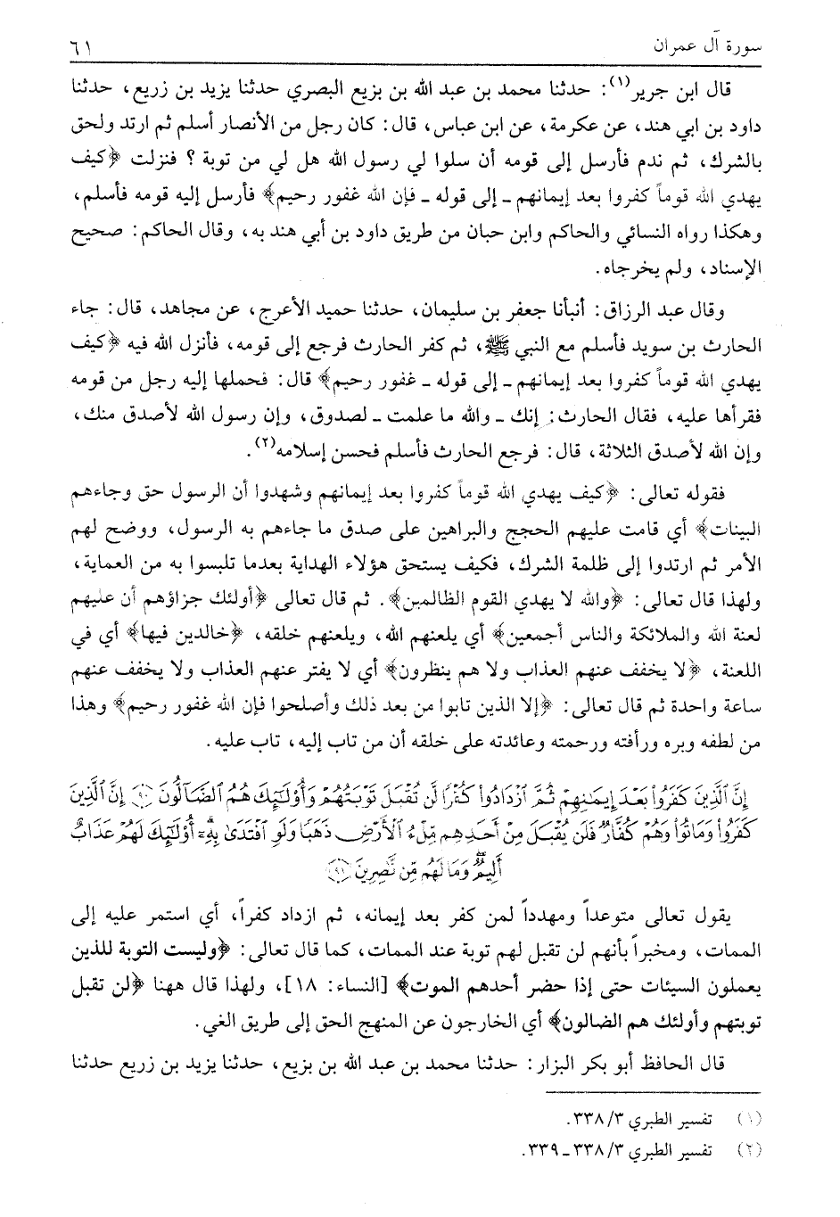 فَقَوْلُهُ تَعَالَى: كَيْفَ يَهْدِي اللَّهُ قَوْماً كَفَرُوا بَعْدَ إِيمانِهِمْ وَشَهِدُوا أَنَّ الرَّسُولَ حَقٌّ وَجاءَهُمُ الْبَيِّناتُ أَيْ قَامَتْ عَلَيْهِمُ الْحُجَجُ وَالْبَرَاهِينُ عَلَى صِدْقِ مَا جَاءَهُمْ بِهِ الرَّسُولُ، وَوَضَحَ لَهُمُ الْأَمْرُ ثُمَّ ارْتَدُّوا إِلَى ظُلْمَةِ الشِّرْكِ، فَكَيْفَ يَسْتَحِقُّ هَؤُلَاءِ الْهِدَايَةَ بَعْدَ مَا تَلَبَّسُوا بِهِ مِنَ الْعَمَايَةِ، ولهذا قال تعالى: وَاللَّهُ لَا يَهْدِي الْقَوْمَ الظَّالِمِينَ. ثُمَّ قَالَ تعالى أُولئِكَ جَزاؤُهُمْ أَنَّ عَلَيْهِمْ لَعْنَةَ اللَّهِ وَالْمَلائِكَةِ وَالنَّاسِ أَجْمَعِينَ أَيْ يَلْعَنُهُمُ اللَّهُ، وَيَلْعَنُهُمْ خَلْقُهُ، خالِدِينَ فِيها أَيْ فِي اللَّعْنَةِ، لَا يُخَفَّفُ عَنْهُمُ الْعَذابُ وَلا هُمْ يُنْظَرُونَ أَيْ لَا يُفَتَّرُ عَنْهُمُ الْعَذَابُ وَلَا يُخَفَّفُ عَنْهُمْ سَاعَةً وَاحِدَةً ثُمَّ قَالَ تَعَالَى: إِلَّا الَّذِينَ تابُوا مِنْ بَعْدِ ذلِكَ وَأَصْلَحُوا فَإِنَّ اللَّهَ غَفُورٌ رَحِيمٌ وَهَذَا مِنْ لُطْفِهِ وَبِرِّهِ وَرَأْفَتِهِ وَرَحْمَتِهِ وعائدته على خلقه أن من تاب إليه، تاب عليه.
