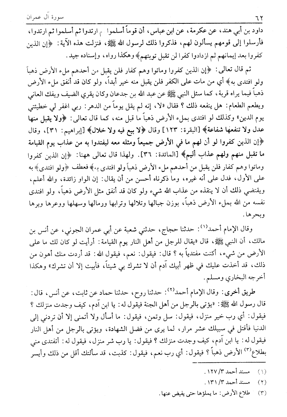 فَيَقُولُ: أَيْ رَبِّ خَيْرُ مَنْزِلٍ، فَيَقُولُ: سَلْ وَتَمَنَّ، فَيَقُولُ: مَا أَسْأَلُ وَلَا أَتَمَنَّى إِلَّا أَنْ تَرُدَّنِي إِلَى الدُّنْيَا فَأُقْتَلَ فِي سَبِيلِكَ عَشْرَ مِرَارٍ، لِمَا يَرَى مِنْ فَضْلِ الشَّهَادَةِ، وَيُؤْتَى بِالرَّجُلِ مِنْ أَهْلِ النَّارِ فَيَقُولُ لَهُ: يَا ابْنَ آدَمَ، كَيْفَ وَجَدْتَ مَنْزِلَكَ؟ فَيَقُولُ: يَا رَبِّ شَرُّ مَنْزِلٍ، فيقول له: أتفتدي مِنِّي بِطِلَاعِ «3» الْأَرْضِ ذَهَبًا؟ فَيَقُولُ: أَيْ رَبِّ نَعَمْ، فَيَقُولُ: كَذَبْتَ، قَدْ سَأَلْتُكَ أَقَلَّ مِنْ ذَلِكَ وأيسر