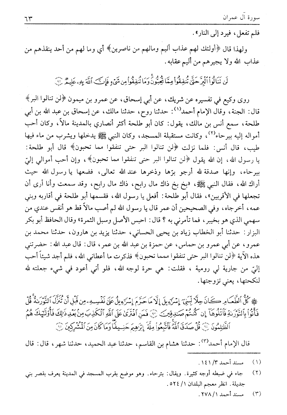 رَوَى وَكِيعٌ فِي تَفْسِيرِهِ عَنْ شَرِيكٍ، عَنْ أَبِي إِسْحَاقَ، عَنْ عَمْرِو بْنِ مَيْمُونٍ لَنْ تَنالُوا الْبِرَّ قال: الْجَنَّةُ، وَقَالَ الْإِمَامُ أَحْمَدُ «1» : حَدَّثَنَا رَوْحٌ، حَدَّثَنَا مَالِكٌ، عَنْ إِسْحَاقَ بْنِ عَبْدِ اللَّهِ بْنِ أَبِي طَلْحَةَ، سَمِعَ أَنَسَ بْنَ مَالِكٍ، يَقُولُ: كَانَ أَبُو طَلْحَةَ أَكْثَرَ أَنْصَارِيٍّ بِالْمَدِينَةِ مَالًا، وَكَانَ أَحَبَّ أَمْوَالِهِ إِلَيْهِ بَيْرَحَاءُ «2» ، وَكَانَتْ مُسْتَقْبِلَةَ الْمَسْجِدِ، وَكَانَ النَّبِيُّ صَلَّى اللَّهُ عَلَيْهِ وَسَلَّمَ يَدْخُلُهَا وَيَشْرَبُ مِنْ مَاءٍ فِيهَا طَيِّبٍ، قَالَ أَنَسٌ: فَلَمَّا نَزَلَتْ لَنْ تَنالُوا الْبِرَّ حَتَّى تُنْفِقُوا مِمَّا تُحِبُّونَ قَالَ أَبُو طَلْحَةَ: