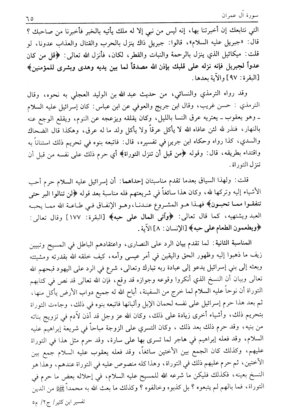 المناسبة الثانية: لما تقدم بيان الرَّدِّ عَلَى النَّصَارَى، وَاعْتِقَادِهِمُ الْبَاطِلِ فِي الْمَسِيحِ وتبيين زَيْفُ مَا ذَهَبُوا إِلَيْهِ وَظُهُورُ الْحَقِّ وَالْيَقِينِ في أمر عيسى وأمه، كيف خَلَقَهُ اللَّهُ بِقُدْرَتِهِ وَمَشِيئَتِهِ وَبَعَثَهُ إِلَى بَنِي إسرائيل يدعو إلى عبادة ربه تبارك وتعالى، شَرَعَ فِي الرَّدِّ عَلَى الْيَهُودِ قَبَّحَهُمُ اللَّهُ تعالى وَبَيَانِ أَنَّ النَّسْخَ الَّذِي أَنْكَرُوا وُقُوعَهُ وَجَوَازَهُ قد وقع، فإن الله تعالى قَدْ نَصَّ فِي كِتَابِهِمُ التَّوْرَاةِ أَنَّ نُوحًا عَلَيْهِ السَّلَامُ لَمَّا خَرَجَ مِنَ السَّفِينَةِ، أَبَاحَ اللَّهُ لَهُ جَمِيعَ دَوَابِّ الْأَرْضِ يَأْكُلُ مِنْهَا، ثُمَّ بَعْدَ هَذَا حَرَّمَ إِسْرَائِيلُ عَلَى نَفْسِهِ لُحْمَانَ الْإِبِلِ وَأَلْبَانَهَا فَاتَّبَعَهُ بَنُوهُ فِي ذَلِكَ، وجاءت التوراة بتحريم ذلك، وأشياء أخرى زِيَادَةً عَلَى ذَلِكَ، وَكَانَ اللَّهُ عَزَّ وَجَلَّ قَدْ أَذِنَ لِآدَمَ فِي تَزْوِيجِ بَنَاتِهِ مِنْ بَنِيهِ، وَقَدْ حَرَّمَ ذَلِكَ بَعْدَ ذَلِكَ، وَكَانَ التَّسَرِّي عَلَى الزَّوْجَةِ مُبَاحًا فِي شَرِيعَةِ إِبْرَاهِيمَ عليه السلام، وقد فعله إِبْرَاهِيمُ فِي هَاجَرَ لَمَّا تَسَرَّى بِهَا عَلَى سَارَّةَ، وَقَدْ حُرِّمَ مِثْلُ هَذَا فِي التَّوْرَاةِ عليهم، وكذلك كان الجمع بين الأختين سائغا، وَقَدْ فَعَلَهُ يَعْقُوبُ عَلَيْهِ السَّلَامُ جَمَعَ بَيْنَ الأختين، ثم حرم عليهم ذلك فِي التَّوْرَاةِ، وَهَذَا كُلُّهُ مَنْصُوصٌ عَلَيْهِ فِي التوراة عندهم، وهذا هُوَ النَّسْخُ بِعَيْنِهِ، فَكَذَلِكَ فَلْيَكُنْ مَا شَرَعَهُ اللَّهُ لِلْمَسِيحِ عَلَيْهِ السَّلَامُ، فِي إِحْلَالِهِ بَعْضَ مَا حَرَّمَ فِي التَّوْرَاةِ، فَمَا بَالُهُمْ لَمْ يَتْبَعُوهُ؟ بَلْ كَذَّبُوهُ وَخَالَفُوهُ؟ وَكَذَلِكَ مَا بَعَثَ اللَّهُ بِهِ مُحَمَّدًا صَلَّى اللَّهُ عَلَيْهِ وَسَلَّمَ من الدين