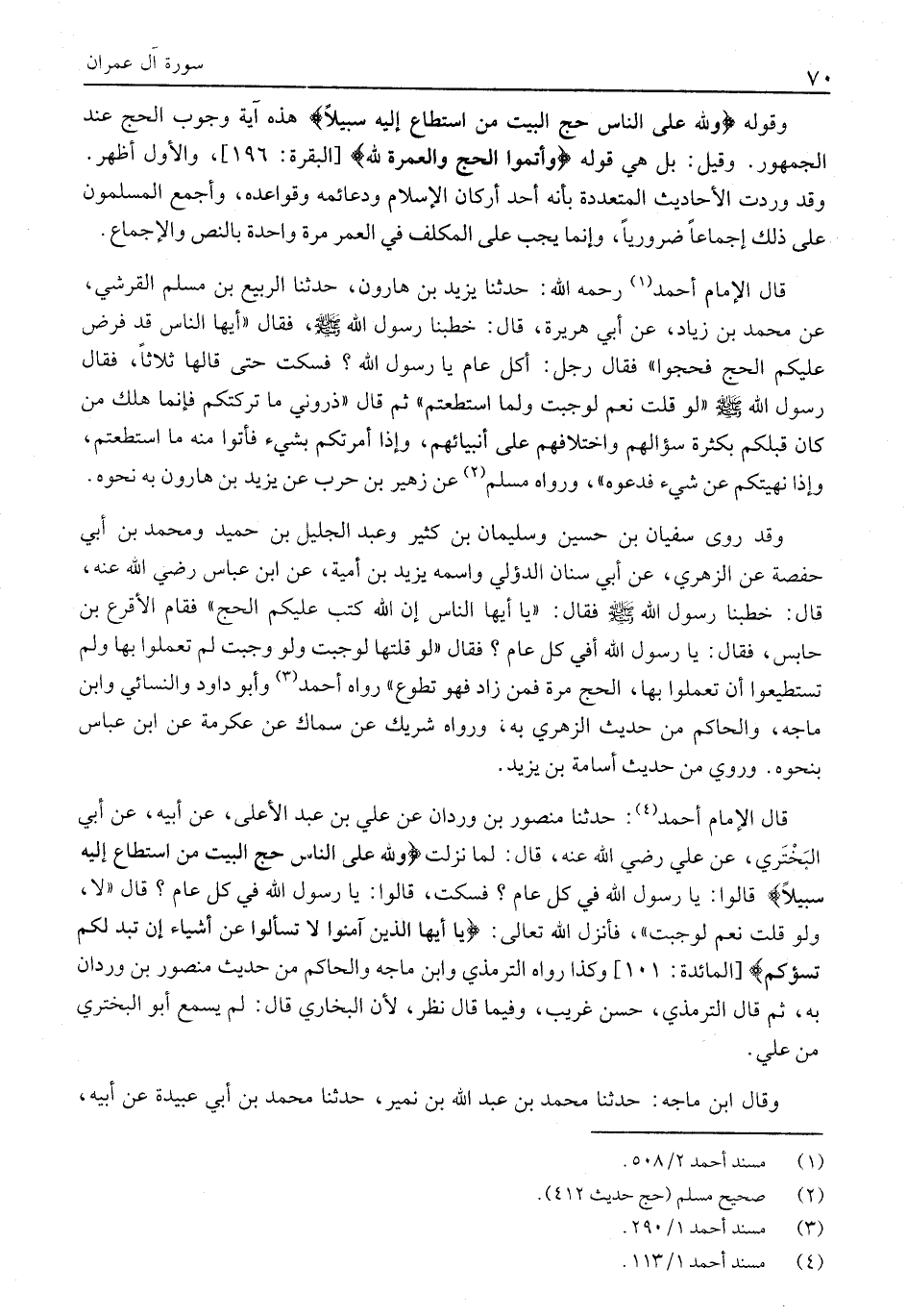 قَالَ الْإِمَامُ أَحْمَدُ «1» رحمه الله: حدثنا يزيد بن هارون، حدثنا الرَّبِيعُ بْنُ مُسْلِمٍ الْقُرَشِيُّ، عَنْ مُحَمَّدِ بْنِ زِيَادٍ، عَنْ أَبِي هُرَيْرَةَ، قَالَ: خَطَبَنَا رَسُولُ اللَّهِ صَلَّى اللَّهُ عَلَيْهِ وَسَلَّمَ، فَقَالَ «أَيُّهَا النَّاسُ قَدْ فُرِضَ عَلَيْكُمُ الْحَجُّ فَحُجُّوا» فَقَالَ رجل: أكل عام يا رسول الله؟ فسكت حَتَّى قَالَهَا ثَلَاثًا، فَقَالَ رَسُولُ اللَّهِ صَلَّى اللَّهُ عَلَيْهِ وَسَلَّمَ «لَوْ قُلْتُ نَعَمْ لَوَجَبَتْ وَلَمَا اسْتَطَعْتُمْ» ثُمَّ قَالَ «ذَرُونِي مَا تَرَكْتُكُمْ فَإِنَّمَا هَلَكَ مَنْ كَانَ قَبْلَكُمْ بِكَثْرَةِ سُؤَالِهِمْ وَاخْتِلَافِهِمْ عَلَى أَنْبِيَائِهِمْ، وَإِذَا أَمَرْتُكُمْ بِشَيْءٍ فَأْتُوا مِنْهُ مَا اسْتَطَعْتُمْ، وَإِذَا نَهَيْتُكُمْ عَنْ شَيْءٍ فَدَعُوهُ» ، وَرَوَاهُ مُسْلِمٌ «2» عَنْ زُهَيْرِ بْنِ حَرْبٍ عَنْ يَزِيدَ بْنِ هَارُونَ بِهِ نَحْوَهُ.
