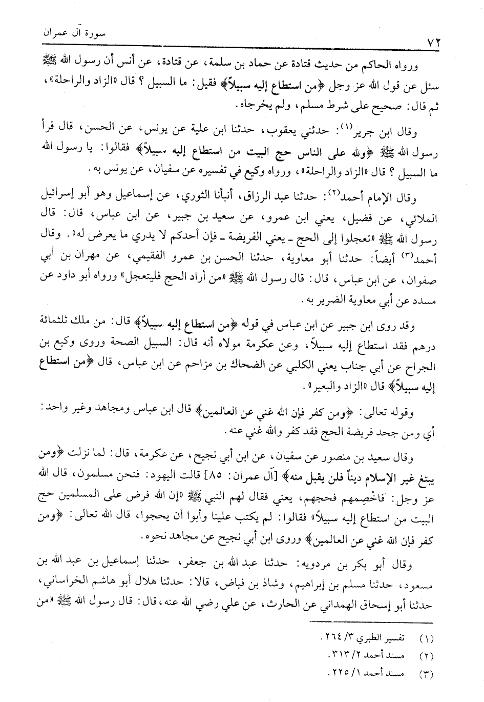 وَقَدْ رَوَى ابْنُ جُبَيْرٍ عَنِ ابْنِ عَبَّاسٍ فِي قَوْلِهِ مَنِ اسْتَطاعَ إِلَيْهِ سَبِيلًا قَالَ: مَنْ مَلَكَ ثَلَاثَمِائَةِ دِرْهَمٍ فَقَدِ اسْتَطَاعَ إِلَيْهِ سَبِيلًا، وَعَنْ عِكْرِمَةَ مَوْلَاهُ أَنَّهُ قَالَ: السَّبِيلُ الصِّحَّةُ وَرَوَى وَكِيعُ بْنُ الْجَرَّاحِ عَنْ أَبِي جَنَابٍ يَعْنِي الْكَلْبِيَّ عَنِ الضَّحَّاكِ بْنِ مُزَاحِمٍ عَنِ ابْنِ عَبَّاسٍ، قَالَ مَنِ اسْتَطاعَ إِلَيْهِ سَبِيلًا قال «الزاد والبعير» .