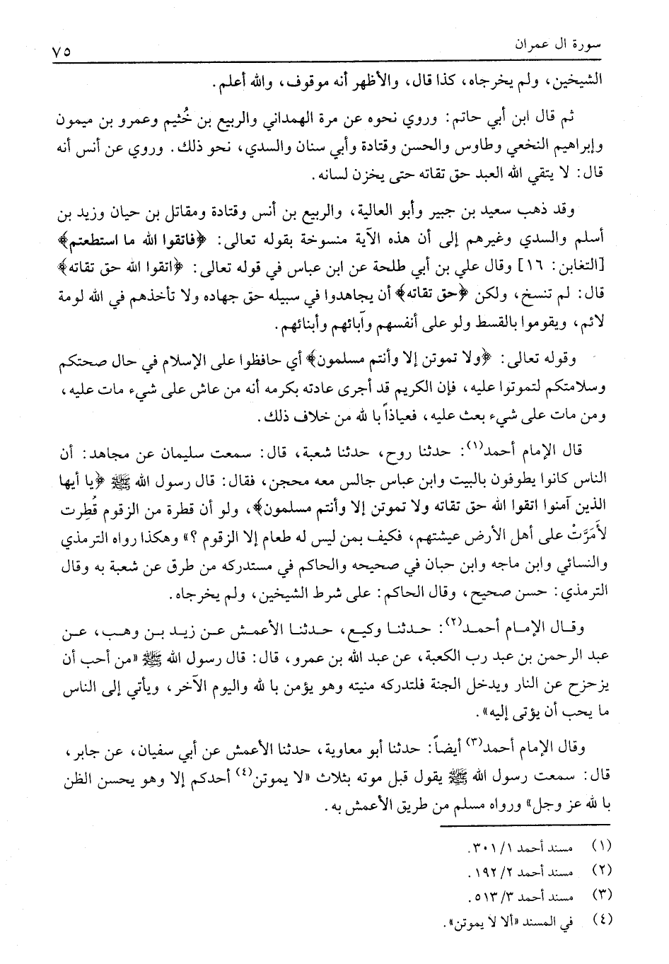 ثُمَّ قَالَ ابْنُ أَبِي حَاتِمٍ: وَرُوِيَ نَحْوُهُ عَنْ مُرَّةَ الْهَمْدَانِيِّ وَالرَّبِيعِ بْنِ خُثَيْمٍ وَعَمْرِو بْنِ مَيْمُونٍ وَإِبْرَاهِيمَ النَّخَعِيِّ وَطَاوُسٍ وَالْحَسَنِ وَقَتَادَةَ وَأَبِي سِنَانٍ وَالسُّدِّيِّ، نَحْوَ ذَلِكَ. وَرُوِيَ عَنْ أَنَسٍ أَنَّهُ قَالَ: لَا يتقي الله العبد حق تقاته حتى يخزن لِسَانِهِ.