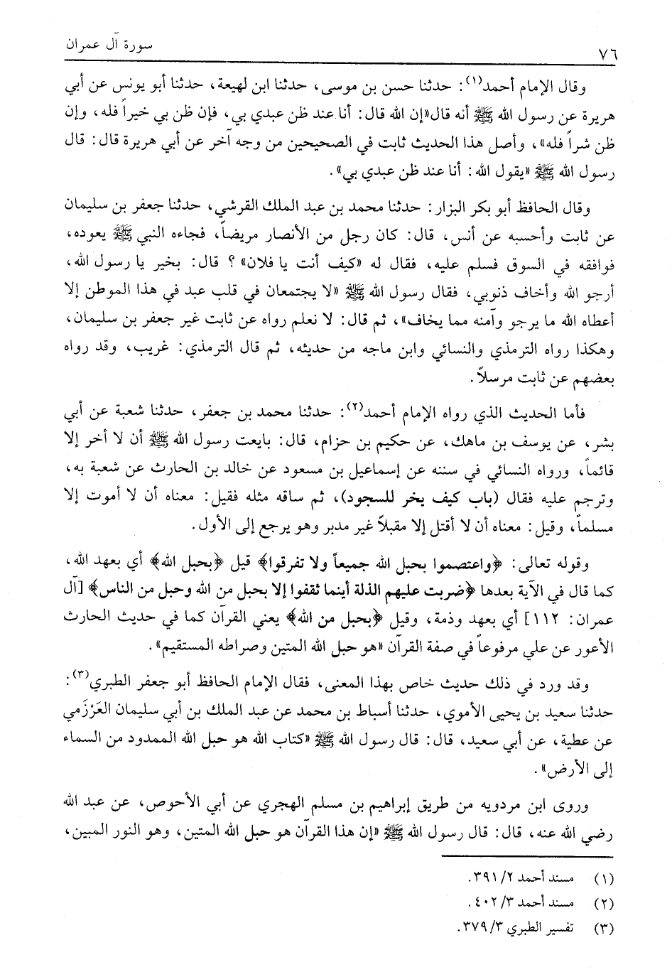 وقوله تعالى: وَاعْتَصِمُوا بِحَبْلِ اللَّهِ جَمِيعاً وَلا تَفَرَّقُوا قِيلَ بِحَبْلِ اللَّهِ أَيْ بِعَهْدِ اللَّهِ، كَمَا قَالَ في الآية بعدها ضُرِبَتْ عَلَيْهِمُ الذِّلَّةُ أَيْنَ مَا ثُقِفُوا إِلَّا بِحَبْلٍ مِنَ اللَّهِ وَحَبْلٍ مِنَ النَّاسِ [آلِ عِمْرَانَ: 112] أَيْ بِعَهْدٍ وَذِمَّةٍ، وَقِيلَ بِحَبْلٍ مِنَ اللَّهِ يَعْنِي الْقُرْآنَ كَمَا فِي حَدِيثِ الْحَارِثِ الْأَعْوَرِ عَنْ عَلِيٍّ مَرْفُوعًا فِي صِفَةِ الْقُرْآنِ «هُوَ حَبْلُ اللَّهِ الْمَتِينُ وَصِرَاطُهُ الْمُسْتَقِيمُ» .