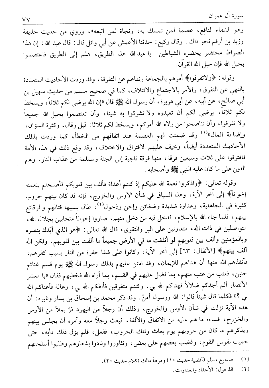 وَقَوْلُهُ: وَلا تَفَرَّقُوا أَمَرَهُمْ بِالْجَمَاعَةِ وَنَهَاهُمْ عَنِ التَّفْرِقَةِ، وَقَدْ وَرَدَتِ الْأَحَادِيثُ الْمُتَعَدِّدَةُ بِالنَّهْيِ عَنِ التَّفَرُّقِ، وَالْأَمْرِ بِالِاجْتِمَاعِ وَالِائْتِلَافِ، كَمَا فِي صَحِيحِ مُسْلِمٍ مِنْ حَدِيثِ سُهَيْلِ بْنِ أَبِي صَالِحٍ، عَنْ أَبِيهِ، عَنْ أَبِي هُرَيْرَةَ، أَنَّ رَسُولَ اللَّهِ صَلَّى اللَّهُ عَلَيْهِ وَسَلَّمَ قَالَ «إِنَّ اللَّهَ يَرْضَى لَكُمْ ثَلَاثًا، وَيَسْخَطُ لَكُمْ ثَلَاثًا، يَرْضَى لَكُمْ أَنْ تَعْبُدُوهُ وَلَا تُشْرِكُوا بِهِ شَيْئًا، وَأَنْ تَعْتَصِمُوا بِحَبْلِ اللَّهِ جَمِيعًا وَلَا تَفَرَّقُوا، وَأَنْ تُنَاصِحُوا مَنْ وَلَّاهُ اللَّهُ أَمْرَكُمْ، وَيَسْخَطُ لَكُمْ ثَلَاثًا: قِيلَ وَقَالَ، وَكَثْرَةَ السُّؤَالِ، وَإِضَاعَةَ الْمَالِ» «1» وَقَدْ ضُمِنَتْ لَهُمُ الْعِصْمَةُ عِنْدَ اتِّفَاقِهِمْ مِنَ الْخَطَأِ، كَمَا وَرَدَتْ بِذَلِكَ الْأَحَادِيثُ الْمُتَعَدِّدَةُ أَيْضًا، وَخِيفَ عَلَيْهِمُ الِافْتِرَاقُ وَالِاخْتِلَافُ، وَقَدْ وَقَعَ ذَلِكَ فِي هَذِهِ الْأُمَّةِ فَافْتَرَقُوا عَلَى ثَلَاثٍ وَسَبْعِينَ فِرْقَةً، مِنْهَا فِرْقَةٌ نَاجِيَةٌ إِلَى الْجَنَّةِ وَمُسَلَّمَةٌ مِنْ عَذَابِ النَّارِ، وَهُمُ الَّذِينَ عَلَى مَا كَانَ عليه النبي صلّى الله عليه وسلّم وأصحابه.