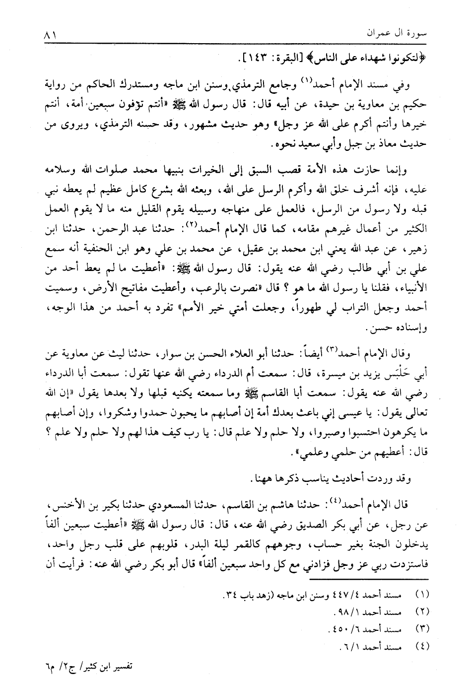 وَفِي مُسْنَدِ الْإِمَامِ أَحْمَدَ «1» وَجَامِعِ التِّرْمِذِيِّ وَسُنَنِ ابْنِ مَاجَهْ وَمُسْتَدْرَكِ الْحَاكِمِ مِنْ رِوَايَةِ حَكِيمِ بْنِ مُعَاوِيَةَ بْنِ حَيْدَةَ، عَنْ أَبِيهِ قَالَ: قَالَ رَسُولُ اللَّهِ صَلَّى اللَّهُ عَلَيْهِ وَسَلَّمَ «أَنْتُمْ تُوفُونَ سَبْعِينَ أُمَّةً، أَنْتُمْ خَيْرُهَا وَأَنْتُمْ أَكْرَمُ عَلَى اللَّهِ عَزَّ وَجَلَّ» وَهُوَ حَدِيثٌ مَشْهُورٌ، وَقَدْ حَسَّنَهُ التِّرْمِذِيُّ، وَيُرْوَى مِنْ حَدِيثِ معاذ بن جبل وأبي سعيد نَحْوَهُ.